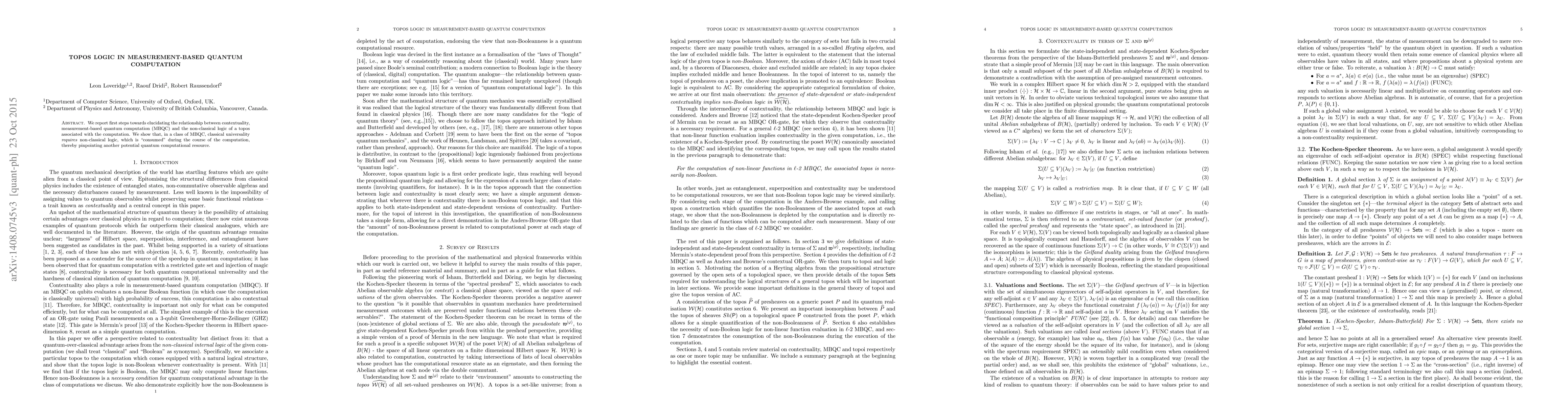 The paper introduces a topos-theoretic framework for measurement-based quantum computation (MBQC), demonstrating the link between contextuality and non-Boolean logic, and showing how non-Boolean logic is consumed during computation.