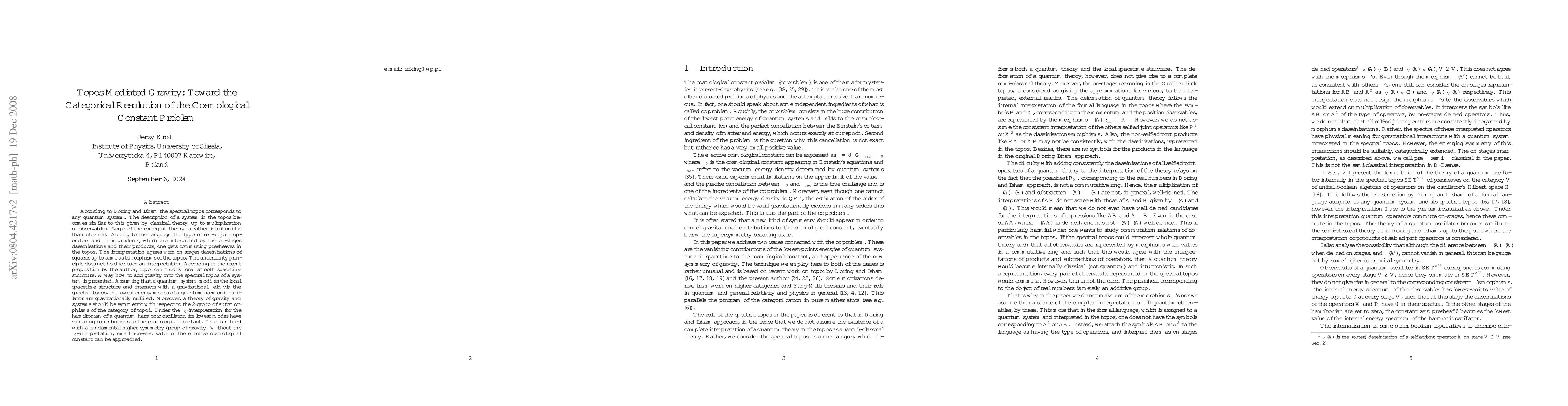 This paper proposes a new approach to resolving the cosmological constant problem by introducing the concept of topos-mediated gravity, which suggests that gravity can be mediated by the spectral topology of quantum systems, potentially leading to a zero or negative cosmological constant.