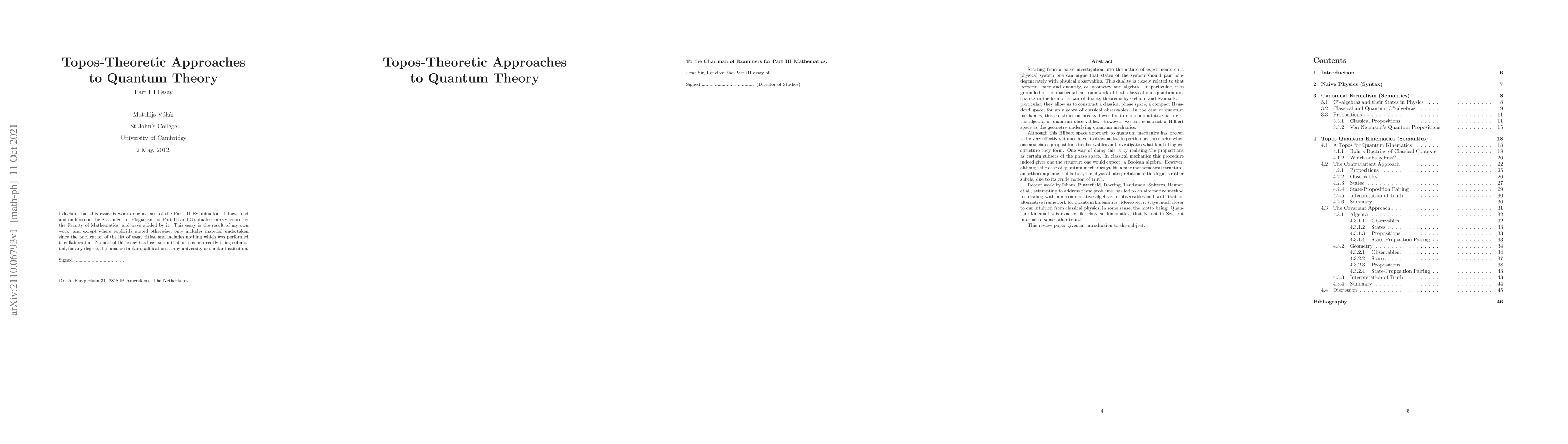 This paper synthesizes topos-theoretic analyses of quantum theory by Isham, Butterfield, Doering, Landsman, Spitters, Heunen et al., aiming to provide a comprehensive overview of their methodological contributions and insights.