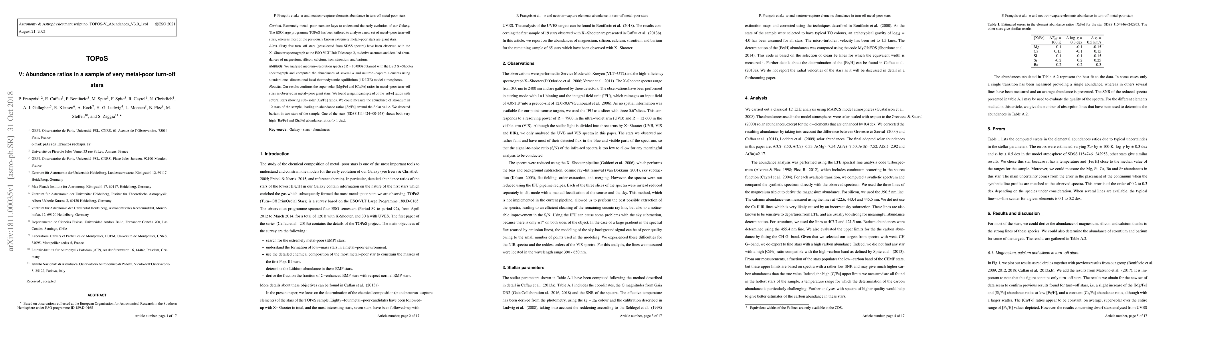 Extremely metal-poor stars are keys to understand the early evolution of our Galaxy. The ESO large programme TOPoS has been tailored to analyse a new set of metal-poor turn-off stars, whereas most of the previously known extremely metal-poor stars are giant stars. Sixty five turn-off stars (preselected from SDSS spectra) have been observed with the X-Shooter spectrograph at the ESO VLT Unit Telescope 2, to derive accurate and detailed abundances of magnesium, silicon, calcium, iron, strontium and barium. We analysed medium-resolution spectra (R ~ 10 000) obtained with the ESO X-Shooter spectrograph and computed the abundances of several alpha and neutron-capture elements using standard one-dimensional local thermodynamic equilibrium (1D LTE) model atmospheres. Our results confirms the super-solar [Mg/Fe] and [Ca/Fe] ratios in metal-poor turn-off stars as observed in metal-poor giant stars. We found a significant spread of the [alpha/Fe] ratios with several stars showing sub-solar [Ca/Fe] ratios. We could measure the abundance of strontium in 12 stars of the sample, leading to abundance ratios [Sr/Fe] around the Solar value. We detected barium in two stars of the sample. One of the stars (SDSS J114424-004658) shows both very high [Ba/Fe] and [Sr/Fe] abundance ratios (>1 dex).