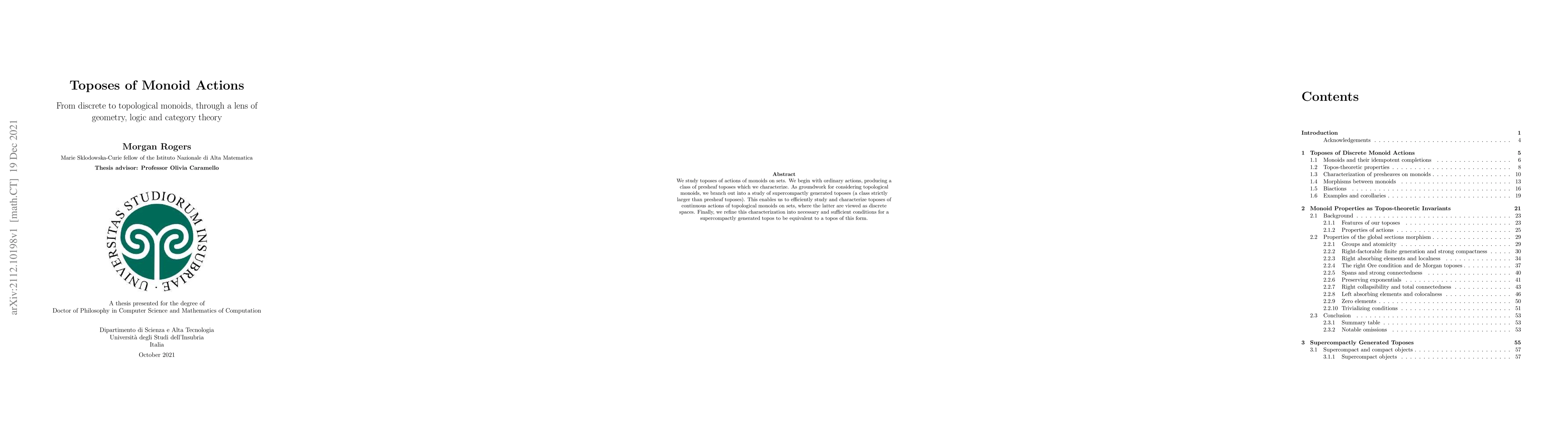 The paper introduces a framework for analyzing toposes of monoid actions, extending from presheaf toposes to supercompactly generated toposes, and provides a characterization of toposes of continuous actions of topological monoids.