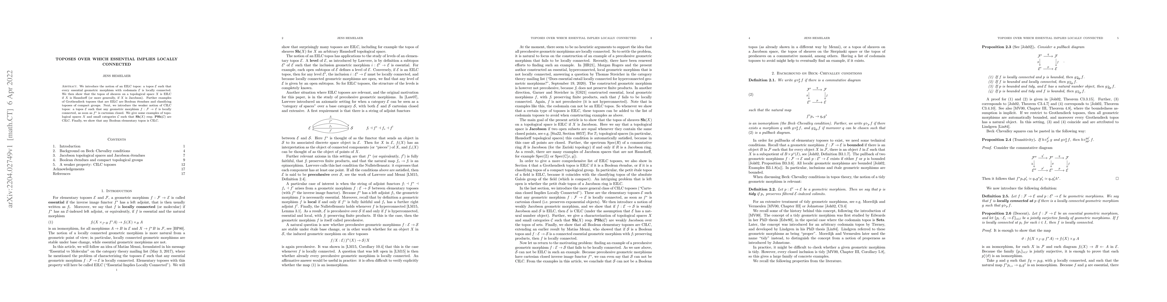 This paper introduces EILC toposes where essential morphisms are locally connected and demonstrates that sheaves on Hausdorff spaces (or Jacobson spaces) are EILC. It also explores CILC toposes, where connected morphisms arise under cartesian closed pullbacks, and provides examples of such toposes.