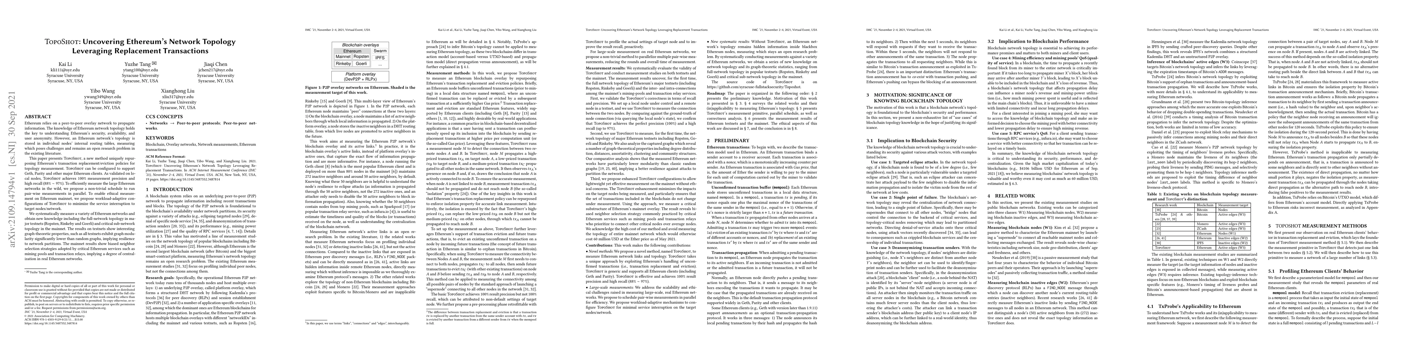 TopoShot leverages Ethereum's transaction replacement policies to measure network topology with high precision and recall, revealing insights into network modularity and centralization in both testnets and the mainnet. The method supports major Ethereum clients and includes adaptive configurations to minimize disruption.
