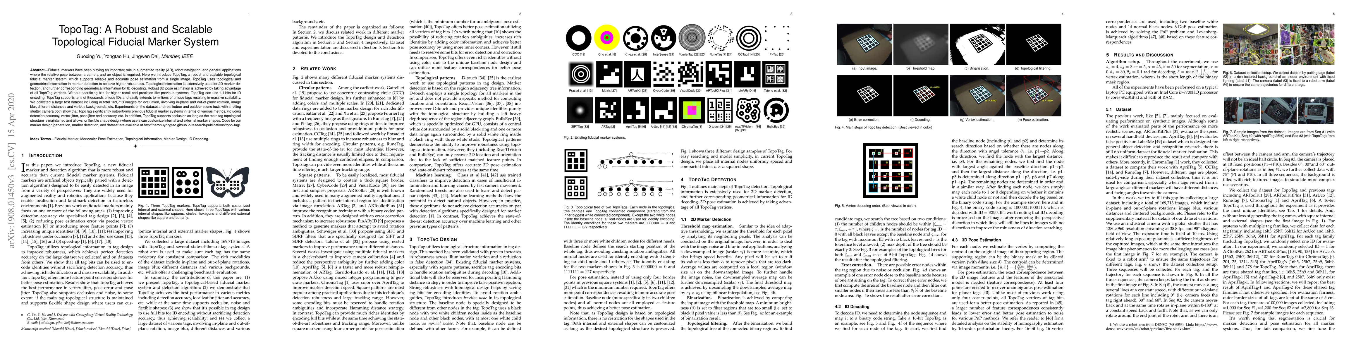 TopoTag is a robust and scalable fiducial marker system that leverages topological and geometrical information for accurate pose estimation, supporting tens of thousands of unique IDs and extending to millions. It outperforms previous systems in detection accuracy and robustness under various conditions, including occlusion and different camera settings.