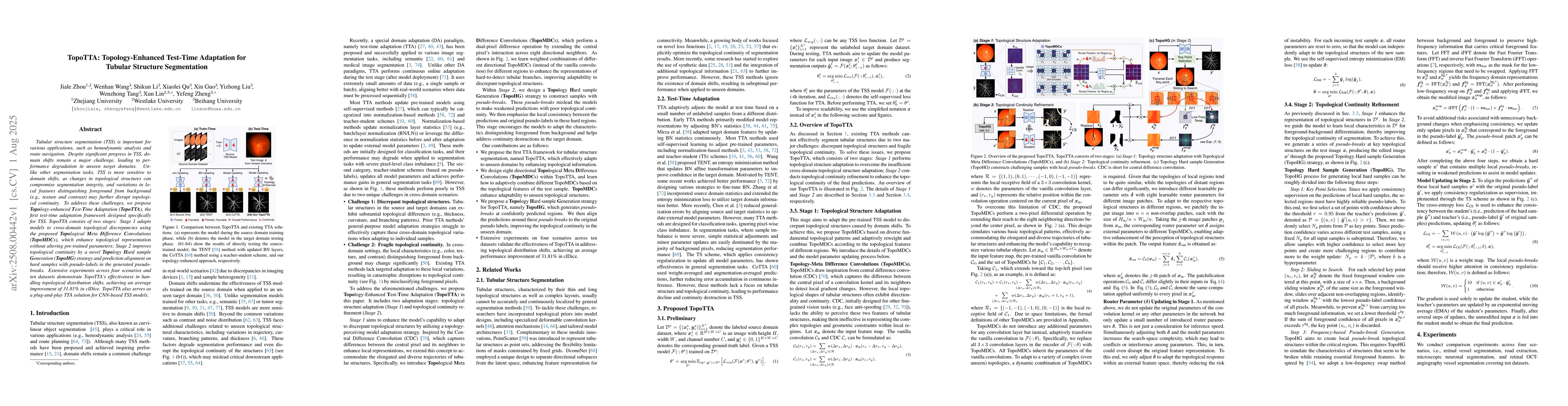 Tubular structure segmentation (TSS) is important for various applications, such as hemodynamic analysis and route navigation. Despite significant progress in TSS, domain shifts remain a major challenge, leading to performance degradation in unseen target domains. Unlike other segmentation tasks, TSS is more sensitive to domain shifts, as changes in topological structures can compromise segmentation integrity, and variations in local features distinguishing foreground from background (e.g., texture and contrast) may further disrupt topological continuity. To address these challenges, we propose Topology-enhanced Test-Time Adaptation (TopoTTA), the first test-time adaptation framework designed specifically for TSS. TopoTTA consists of two stages: Stage 1 adapts models to cross-domain topological discrepancies using the proposed Topological Meta Difference Convolutions (TopoMDCs), which enhance topological representation without altering pre-trained parameters; Stage 2 improves topological continuity by a novel Topology Hard sample Generation (TopoHG) strategy and prediction alignment on hard samples with pseudo-labels in the generated pseudo-break regions. Extensive experiments across four scenarios and ten datasets demonstrate TopoTTA's effectiveness in handling topological distribution shifts, achieving an average improvement of 31.81% in clDice. TopoTTA also serves as a plug-and-play TTA solution for CNN-based TSS models.