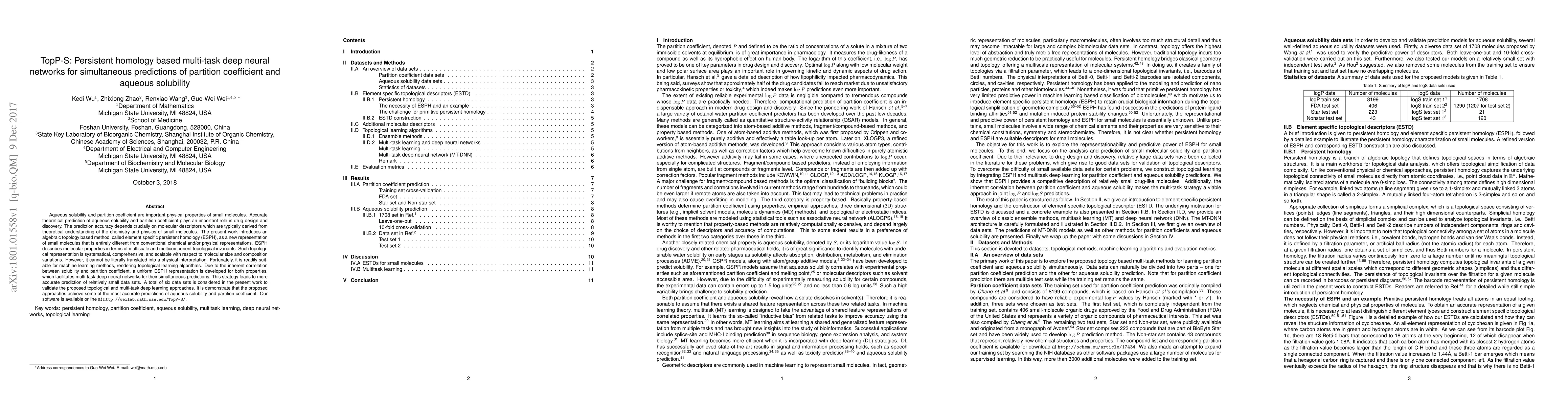 This paper introduces a persistent homology based method, TopP-S, for predicting aqueous solubility and partition coefficient in small molecules using multi-task deep neural networks. The element specific persistent homology (ESPH) representation offers a novel topological approach that enhances the accuracy of predictions, especially for small datasets.