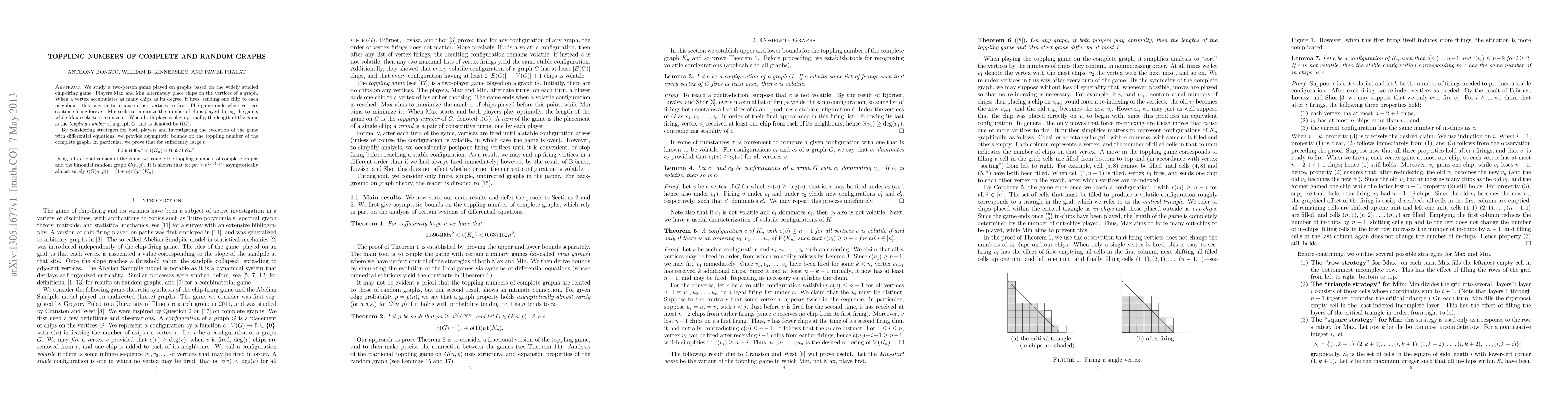 We study a two-person game played on graphs based on the widely studied chip-firing game. Players Max and Min alternately place chips on the vertices of a graph. When a vertex accumulates as many chips as its degree, it fires, sending one chip to each neighbour; this may in turn cause other vertices to fire. The game ends when vertices continue firing forever. Min seeks to minimize the number of chips played during the game, while Max seeks to maximize it. When both players play optimally, the length of the game is the {\em toppling number} of a graph $G$, and is denoted by $\tg(G)$. By considering strategies for both players and investigating the evolution of the game with differential equations, we provide asymptotic bounds on the toppling number of the complete graph. In particular, we prove that for sufficiently large $n$ $$0.596400 n^2 < \tg(K_n) < 0.637152 n^2.$$ Using a fractional version of the game, we couple the toppling numbers of complete graphs and the binomial random graph $G(n,p)$. It is shown that for $pn \ge n^{2/\sqrt{\log n}}$ asymptotically almost surely $t(G(n,p))=(1+o(1))p\tg(K_n)$.
