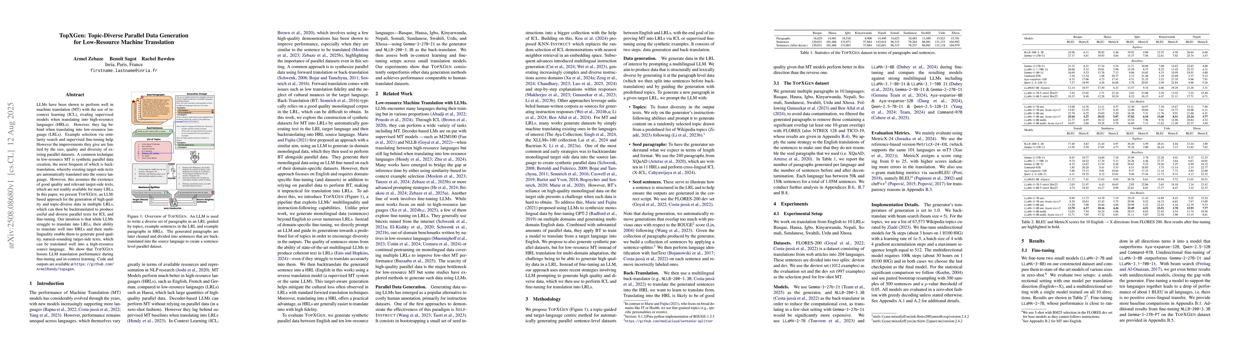 LLMs have been shown to perform well in machine translation (MT) with the use of in-context learning (ICL), rivaling supervised models when translating into high-resource languages (HRLs). However, they lag behind when translating into low-resource language (LRLs). Example selection via similarity search and supervised fine-tuning help. However the improvements they give are limited by the size, quality and diversity of existing parallel datasets. A common technique in low-resource MT is synthetic parallel data creation, the most frequent of which is backtranslation, whereby existing target-side texts are automatically translated into the source language. However, this assumes the existence of good quality and relevant target-side texts, which are not readily available for many LRLs. In this paper, we present \textsc{TopXGen}, an LLM-based approach for the generation of high quality and topic-diverse data in multiple LRLs, which can then be backtranslated to produce useful and diverse parallel texts for ICL and fine-tuning. Our intuition is that while LLMs struggle to translate into LRLs, their ability to translate well into HRLs and their multilinguality enable them to generate good quality, natural-sounding target-side texts, which can be translated well into a high-resource source language. We show that \textsc{TopXGen} boosts LLM translation performance during fine-tuning and in-context learning. Code and outputs are available at https://github.com/ArmelRandy/topxgen.