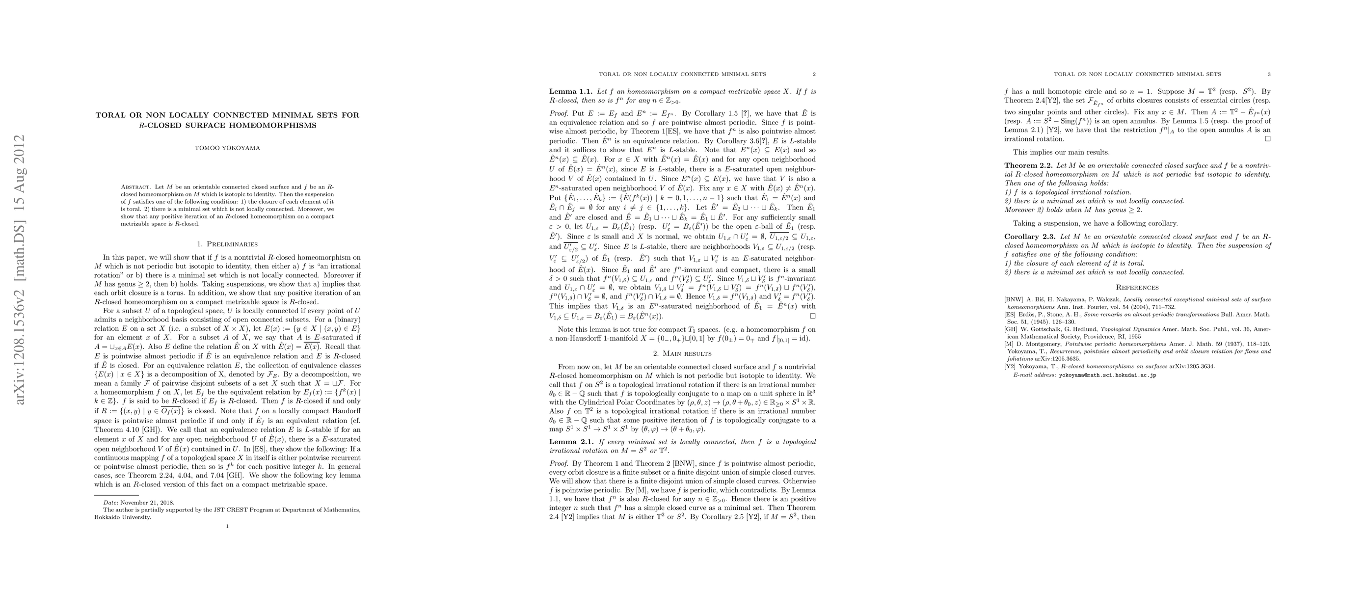 This paper investigates suspensions of $R$-closed surface homeomorphisms, showing they are either toral or non-locally connected minimal sets. It also proves that any positive iteration of an $R$-closed homeomorphism on a compact metrizable space is $R$-closed.