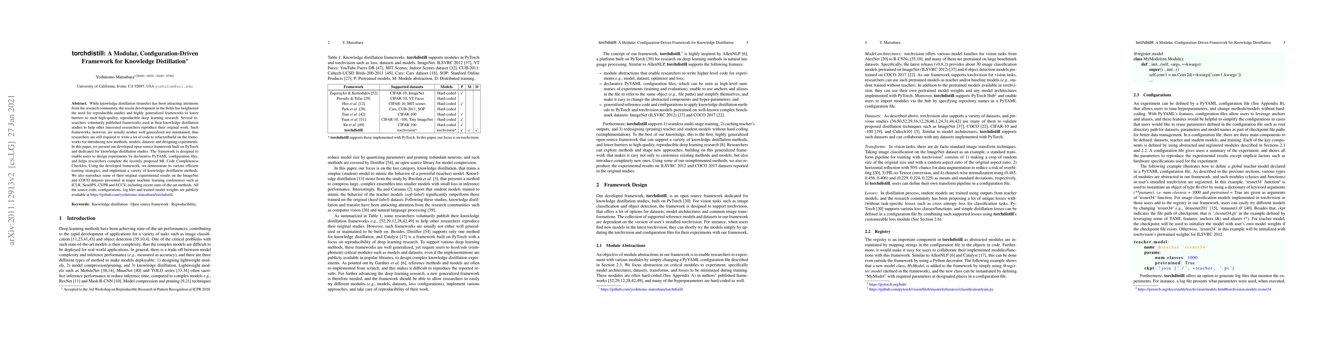 Researchers developed an open-source framework called torchdistill for knowledge distillation studies, allowing users to design experiments with a declarative configuration file and reproducing experimental results on ImageNet and COCO datasets.