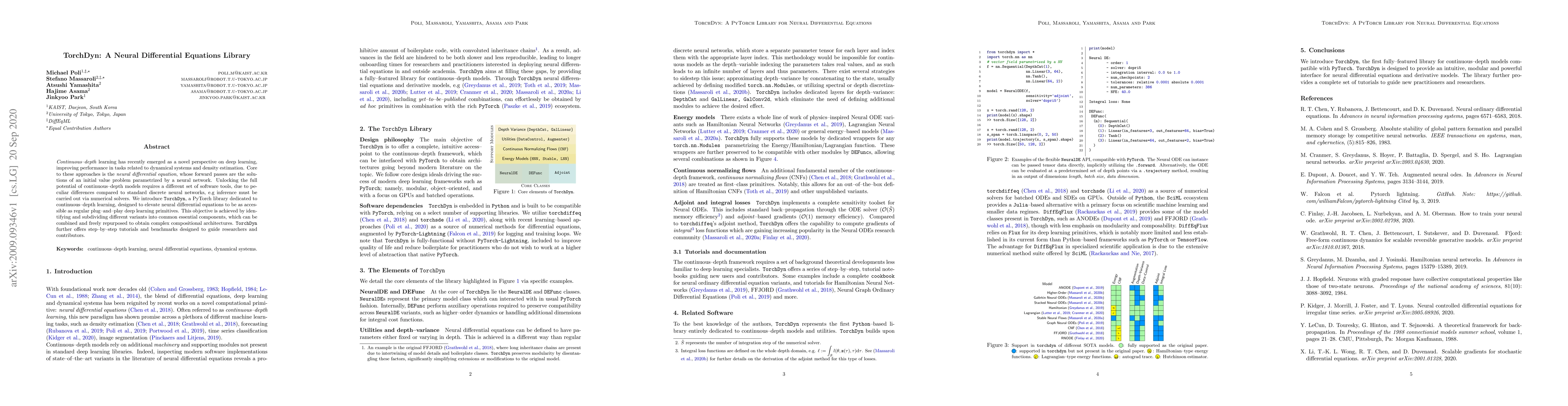 TorchDyn is a PyTorch library aimed at simplifying continuous-depth learning through neural differential equations, providing accessible tools for constructing complex architectures and offering tutorials and benchmarks for researchers. It addresses the unique challenges of continuous-depth models by integrating numerical solvers and modular components.