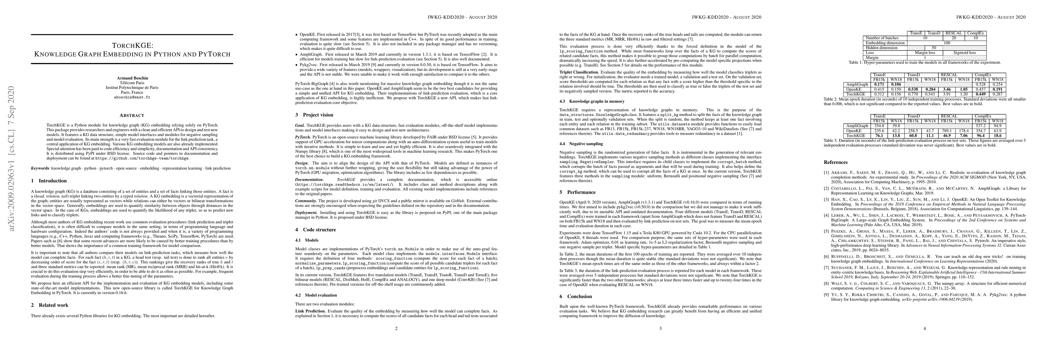 TorchKGE is a Python module for knowledge graph embedding that leverages PyTorch, offering a clean API for designing and testing new models. It includes efficient tools for link prediction, various implemented KG embedding models, and emphasizes code efficiency and simplicity.