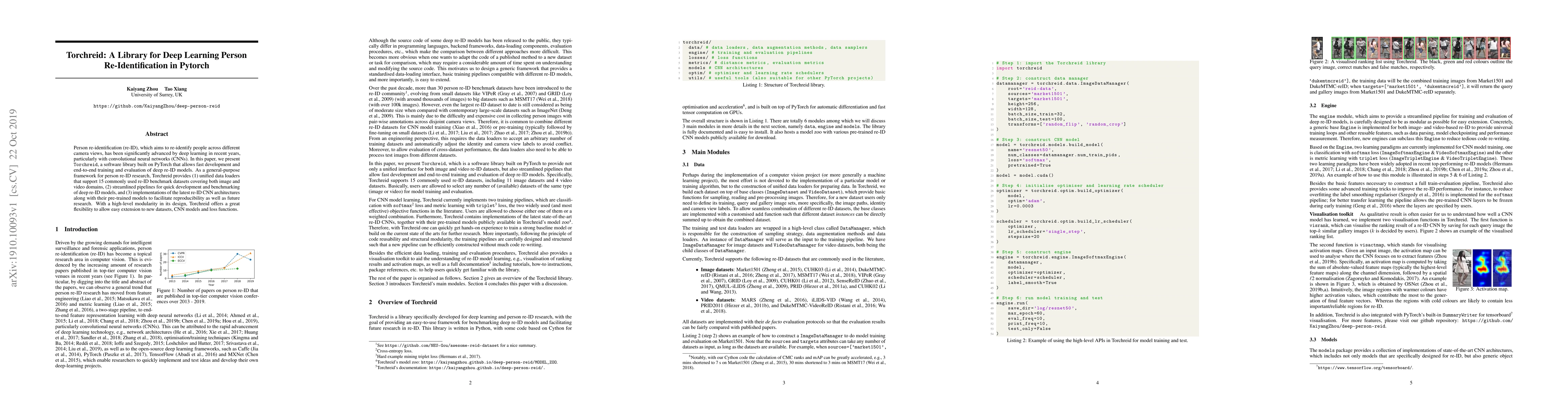 Torchreid is a PyTorch-based library for developing and evaluating deep learning models for person re-identification. It offers a modular framework with support for 15 benchmark datasets, streamlined pipelines, and pre-trained CNN models to facilitate research and reproducibility.