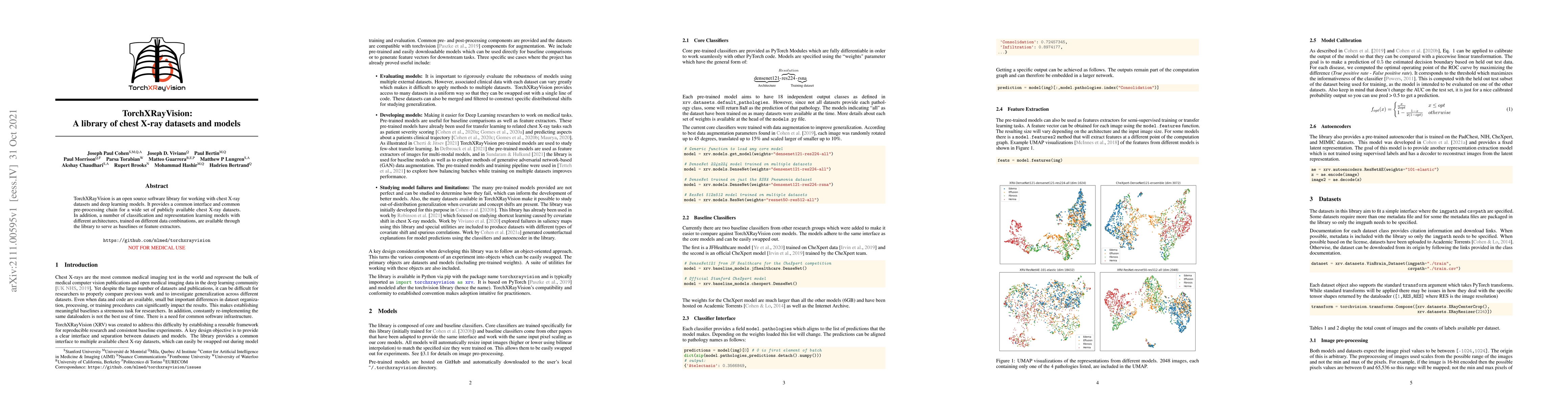 TorchXRayVision is an open source software library for working with chest X-ray datasets and deep learning models. It provides a common interface and common pre-processing chain for a wide set of publicly available chest X-ray datasets. In addition, a number of classification and representation learning models with different architectures, trained on different data combinations, are available through the library to serve as baselines or feature extractors.