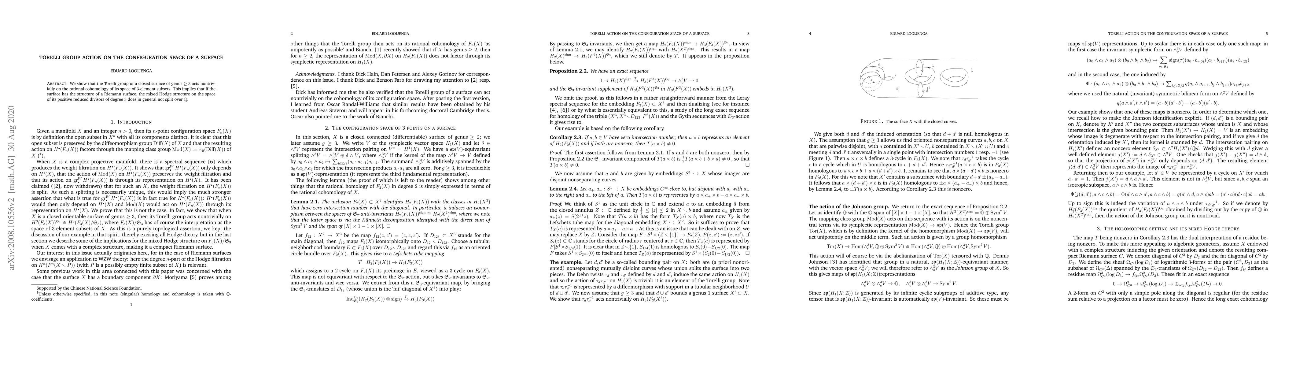 This research demonstrates that the Torelli group, crucial in understanding the moduli space of surfaces, has a nontrivial action on the rational cohomology of a closed surface of genus at least 3's 3-element subset configuration space, implying deeper connections between geometric structures and algebraic invariants.