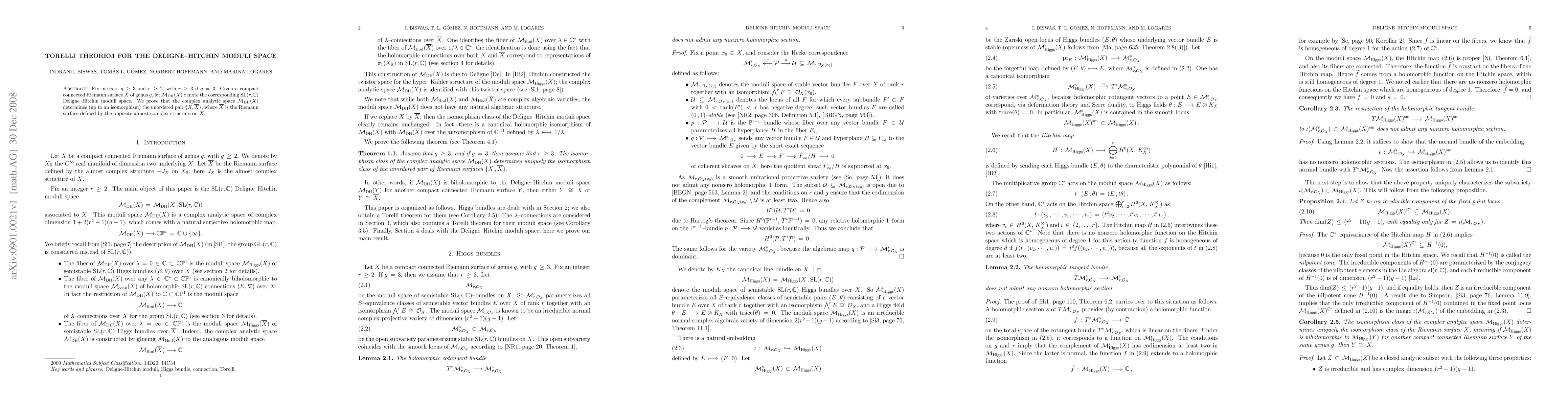 The paper proves that the Deligne--Hitchin moduli space determines a unique unordered pair of Riemann surfaces up to isomorphism, based on their almost complex structures.