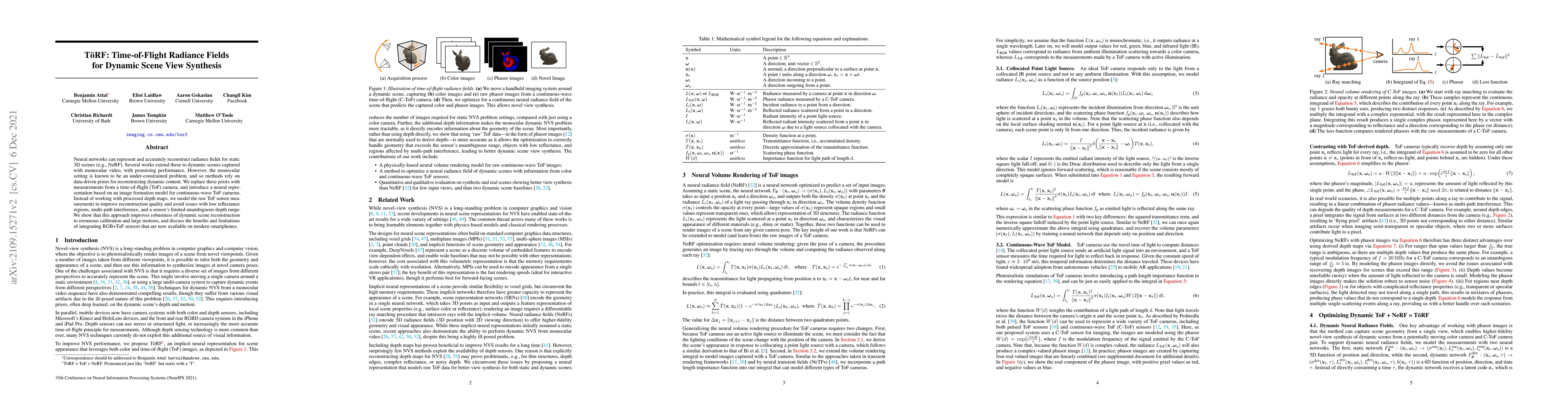 The paper introduces T"oRF, a neural representation for dynamic scene view synthesis using time-of-flight (ToF) camera measurements. Unlike previous methods relying on data-driven priors, T"oRF models raw ToF sensor data, enhancing reconstruction quality and addressing issues like low reflectance, multi-path interference, and depth range limitations. This approach improves robustness to calibration errors and large motions, with potential applications in modern RGB+ToF sensor-equipped devices.