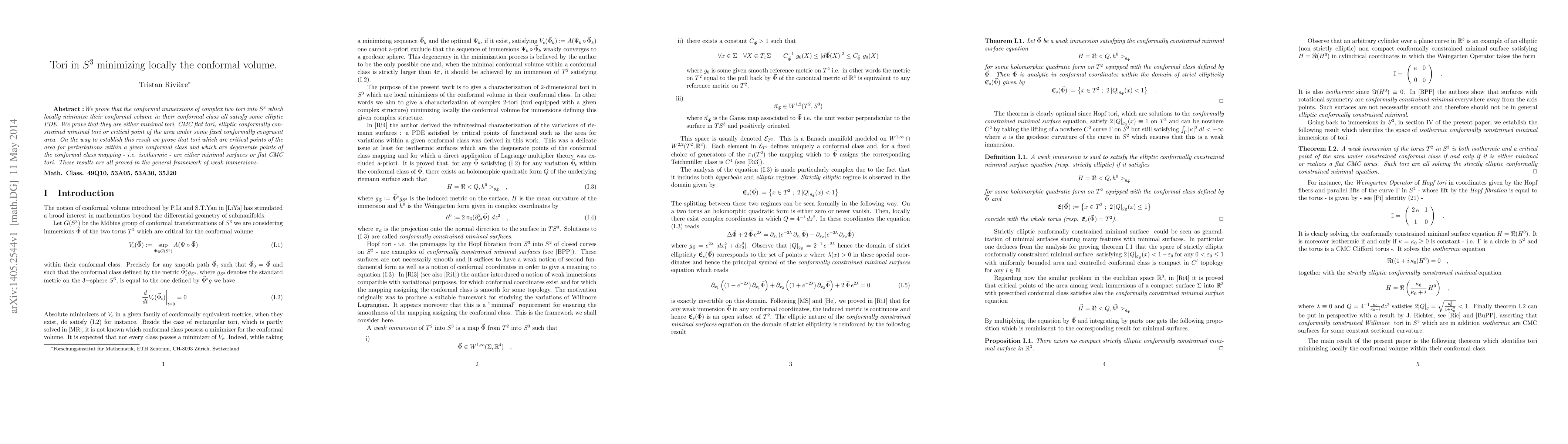 We prove that the conformal immersions of complex two tori into $S^3$ which locally minimize their conformal volume in their conformal class all satisfy some elliptic PDE. We prove that they are either minimal tori, CMC flat tori, elliptic conformally constrained minimal tori or critical point of the area under some fixed conformally congruent area. On the way to establish this result we prove that tori which are critical points of the area for perturbations within a given conformal class and which are degenerate points of the conformal class mapping - i.e. isothermic - are either minimal surfaces or flat CMC tori. These results are all proved in the general framework of weak immersions.