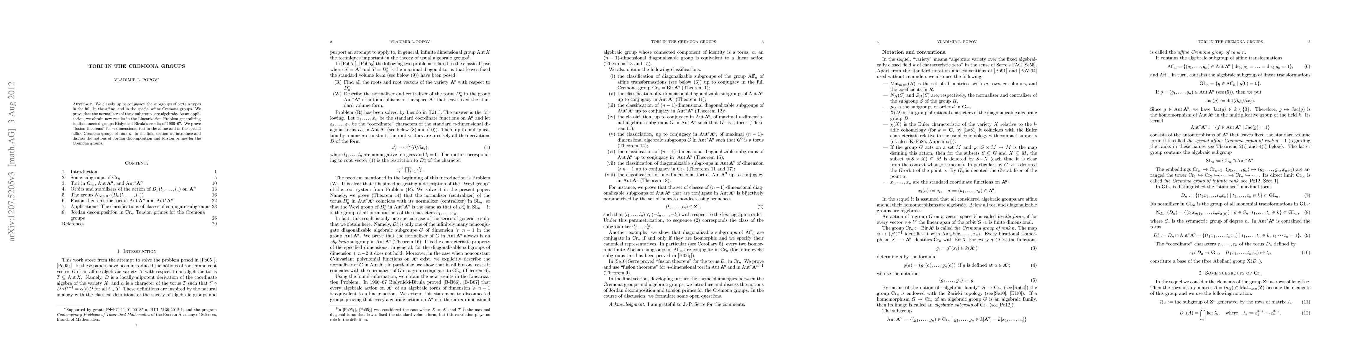 Researchers classify subgroups in Cremona groups, proving normalizers are algebraic and generalizing Linearization Problem results to disconnected groups. They also establish 'fusion theorems' for n-dimensional tori in affine and special affine Cremona groups of rank n.