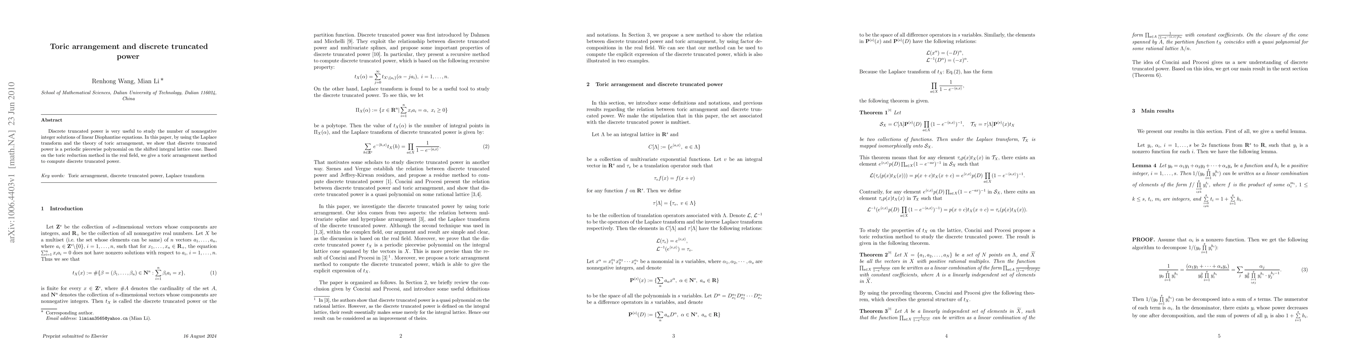 This paper demonstrates that discrete truncated power is a periodic piecewise polynomial on the shifted integral lattice cone using Laplace transform and toric arrangement theory. It also introduces a toric reduction method to compute discrete truncated power in the real field.