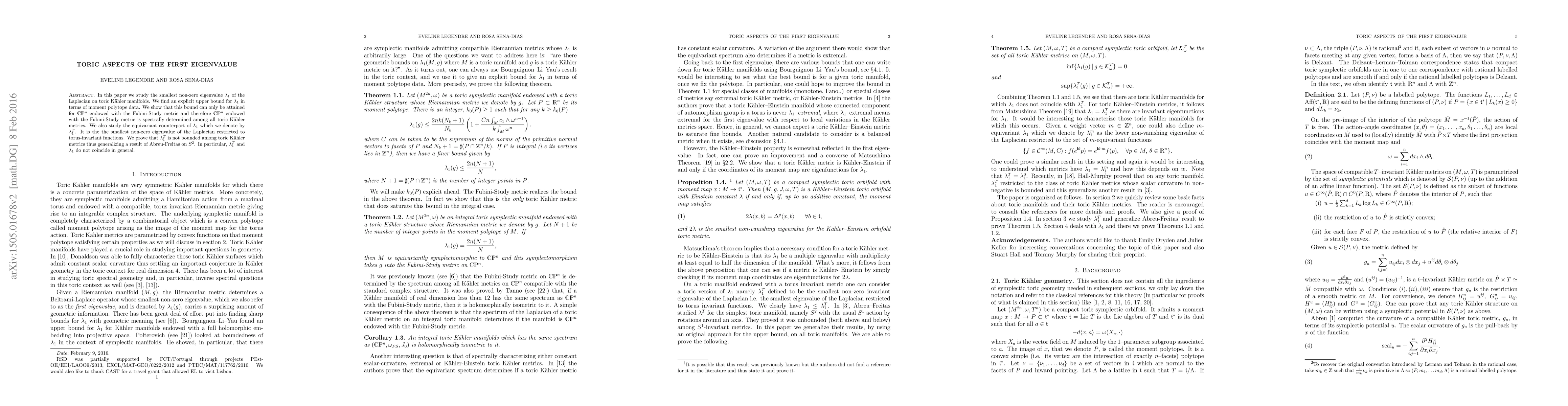 In this paper we study the smallest non-zero eigenvalue $\lambda_1$ of the Laplacian on toric K\"ahler manifolds. We find an explicit upper bound for $\lambda_1$ in terms of moment polytope data. We show that this bound can only be attained for $\mathbb{CP}^n$ endowed with the Fubini-Study metric and therefore $\mathbb{CP}^n$ endowed with the Fubini-Study metric is spectrally determined among all toric K\"ahler metrics. We also study the equivariant counterpart of $\lambda_1$ which we denote by $\lambda_1^T$. It is the the smallest non-zero eigenvalue of the Laplacian restricted to torus-invariant functions. We prove that $\lambda_1^T$ is not bounded among toric K\"ahler metrics thus generalizing a result of Abreu-Freitas on $S^2$. In particular, $\lambda_1^T$ and $\lambda_1$ do not coincide in general.