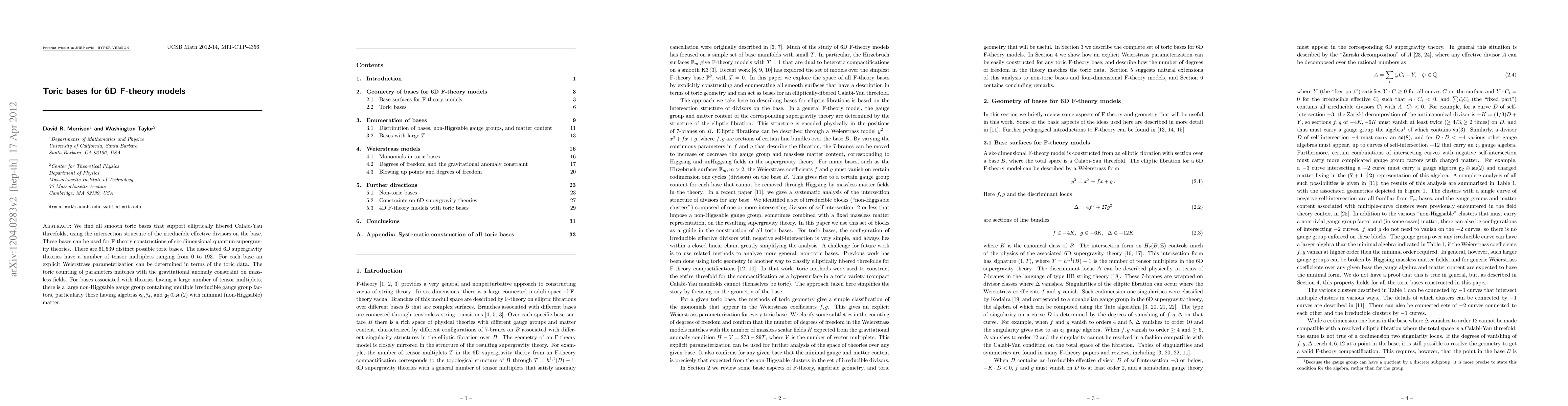 We find all smooth toric bases that support elliptically fibered Calabi-Yau threefolds, using the intersection structure of the irreducible effective divisors on the base. These bases can be used for F-theory constructions of six-dimensional quantum supergravity theories. There are 61,539 distinct possible toric bases. The associated 6D supergravity theories have a number of tensor multiplets ranging from 0 to 193. For each base an explicit Weierstrass parameterization can be determined in terms of the toric data. The toric counting of parameters matches with the gravitational anomaly constraint on massless fields. For bases associated with theories having a large number of tensor multiplets, there is a large non-Higgsable gauge group containing multiple irreducible gauge group factors, particularly those having algebras e_8, f_4 and (g_2 + su(2)) with minimal (non-Higgsable) matter.