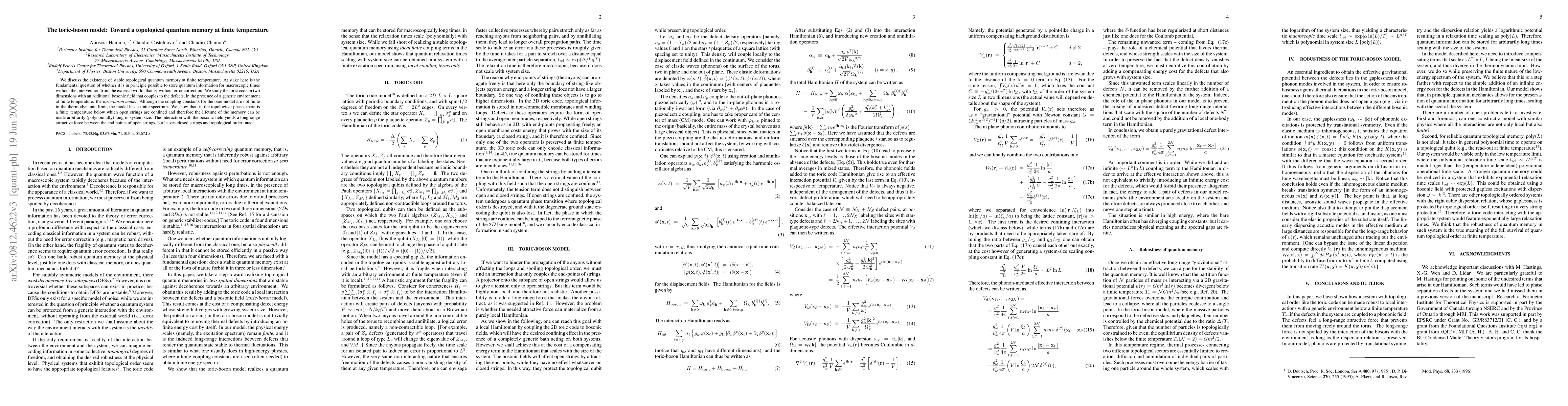 This paper explores the feasibility of stable topological quantum memory at finite temperature using the toric-boson model. It demonstrates that below a certain finite temperature, open strings are confined, allowing the memory to have a long lifetime, while preserving topological order and closed strings.