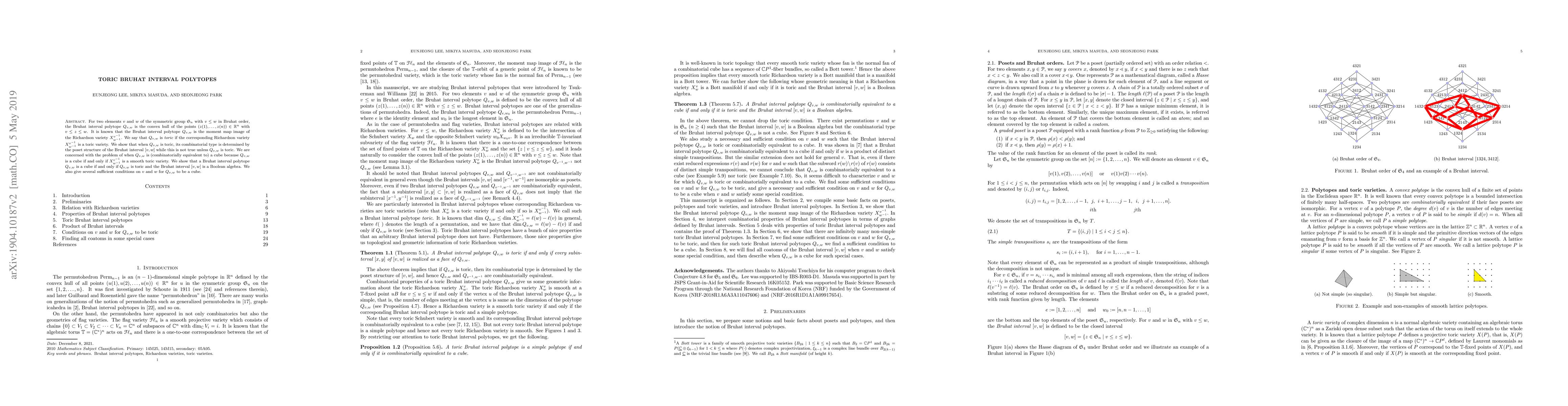 For two elements $v$ and $w$ of the symmetric group $\mathfrak{S}_n$ with $v\leq w$ in Bruhat order, the Bruhat interval polytope $Q_{v,w}$ is the convex hull of the points $(z(1),\ldots,z(n))\in \mathbb{R}^n$ with $v\leq z\leq w$. It is known that the Bruhat interval polytope $Q_{v,w}$ is the moment map image of the Richardson variety $X^{v^{-1}}_{w^{-1}}$. We say that $Q_{v,w}$ is \emph{toric} if the corresponding Richardson variety $X_{w^{-1}}^{v^{-1}}$ is a toric variety. We show that when $Q_{v,w}$ is toric, its combinatorial type is determined by the poset structure of the Bruhat interval $[v,w]$ while this is not true unless $Q_{v,w}$ is toric. We are concerned with the problem of when $Q_{v,w}$ is (combinatorially equivalent to) a cube because $Q_{v,w}$ is a cube if and only if $X_{w^{-1}}^{v^{-1}}$ is a smooth toric variety. We show that a Bruhat interval polytope $Q_{v,w}$ is a cube if and only if $Q_{v,w}$ is toric and the Bruhat interval $[v,w]$ is a Boolean algebra. We also give several sufficient conditions on $v$ and $w$ for $Q_{v,w}$ to be a cube.