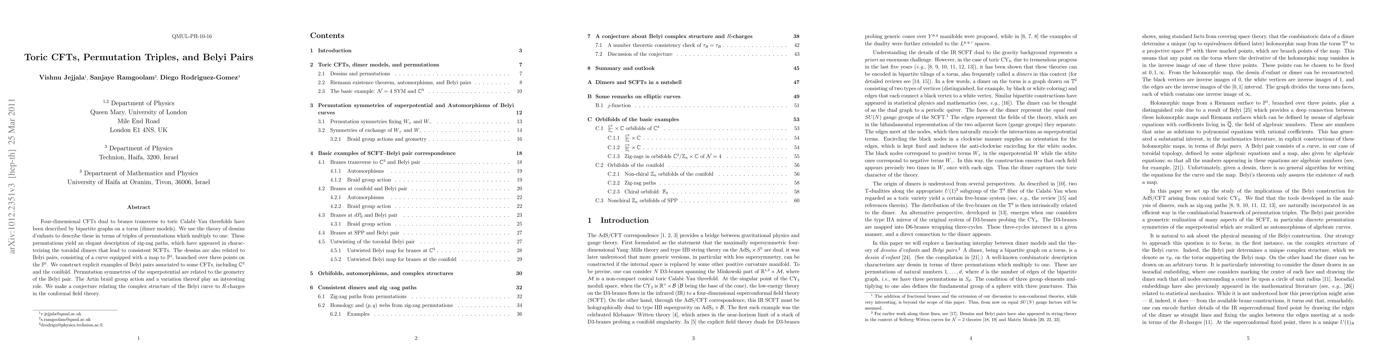 Four-dimensional CFTs dual to branes transverse to toric Calabi-Yau threefolds have been described by bipartite graphs on a torus (dimer models). We use the theory of dessins d'enfants to describe these in terms of triples of permutations which multiply to one. These permutations yield an elegant description of zig-zag paths, which have appeared in characterizing the toroidal dimers that lead to consistent SCFTs. The dessins are also related to Belyi pairs, consisting of a curve equipped with a map to P^1, branched over three points on the P^1. We construct explicit examples of Belyi pairs associated to some CFTs, including C^3 and the conifold. Permutation symmetries of the superpotential are related to the geometry of the Belyi pair. The Artin braid group action and a variation thereof play an interesting role. We make a conjecture relating the complex structure of the Belyi curve to R-charges in the conformal field theory.