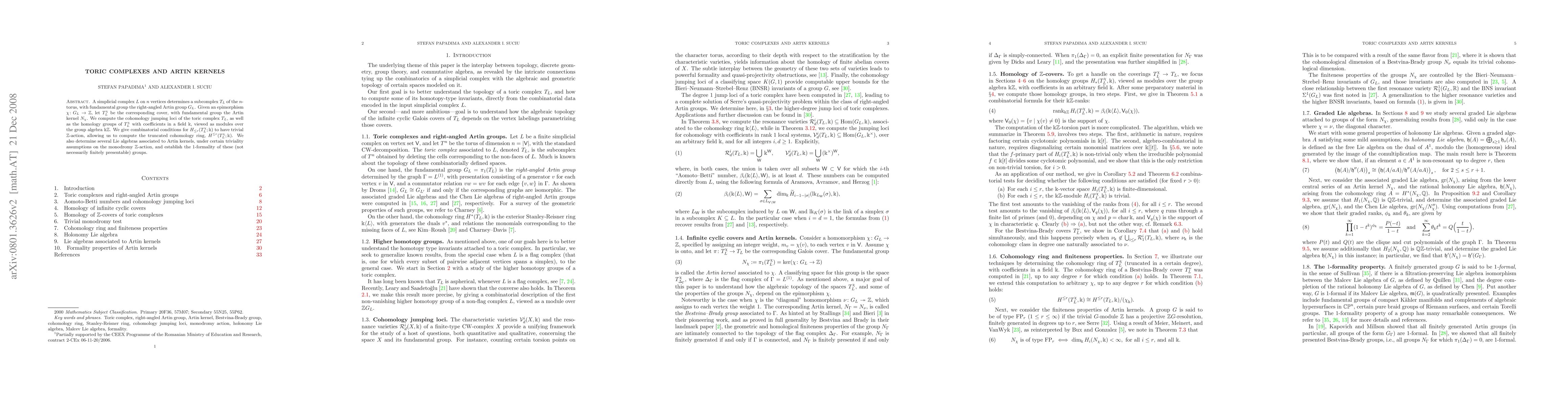 A simplicial complex L on n vertices determines a subcomplex T_L of the n-torus, with fundamental group the right-angled Artin group G_L. Given an epimorphism \chi\colon G_L\to \Z, let T_L^\chi be the corresponding cover, with fundamental group the Artin kernel N_\chi. We compute the cohomology jumping loci of the toric complex T_L, as well as the homology groups of T_L^\chi with coefficients in a field \k, viewed as modules over the group algebra \k\Z. We give combinatorial conditions for H_{\le r}(T_L^\chi;\k) to have trivial \Z-action, allowing us to compute the truncated cohomology ring, H^{\le r}(T_L^\chi;\k). We also determine several Lie algebras associated to Artin kernels, under certain triviality assumptions on the monodromy \Z-action, and establish the 1-formality of these (not necessarily finitely presentable) groups.