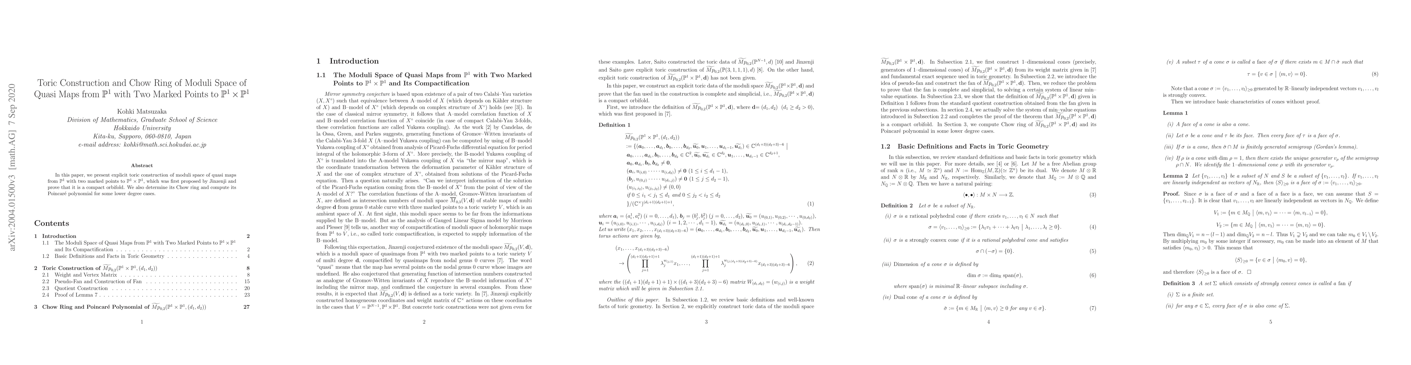 This paper provides an explicit toric construction of the moduli space of quasi maps from $\mathbb{P}^1$ with two marked points to $\mathbb{P}^1 \times \mathbb{P}^1$, proving it to be a compact orbifold, and determines its Chow ring and computes its Poincaré polynomial for lower degrees.