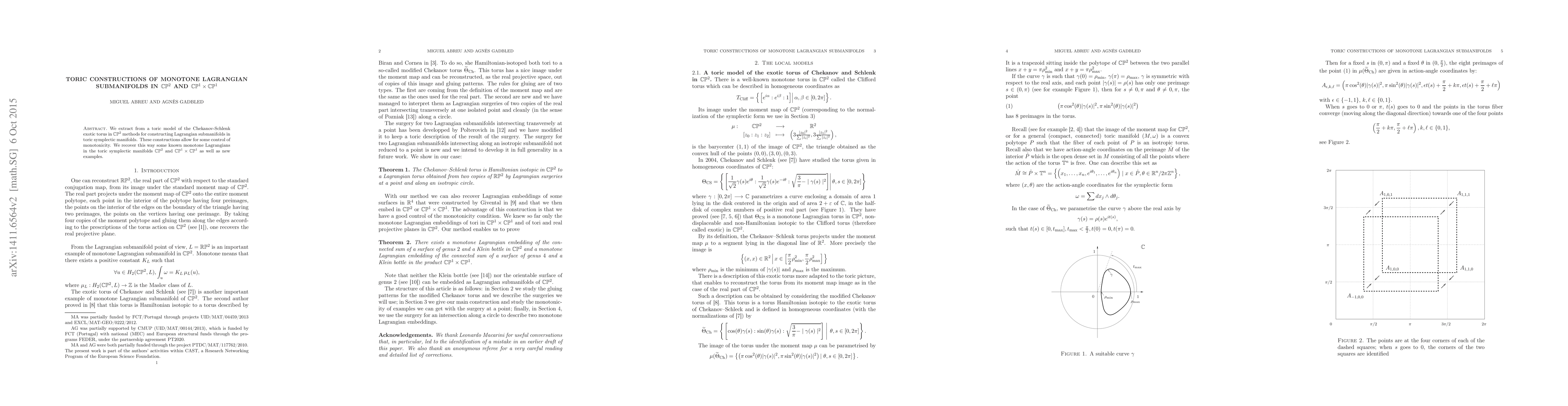 The paper develops toric construction techniques to create monotone Lagrangian submanifolds in $\mathbb{CP}^2$ and $\mathbb{CP}^1 \times \mathbb{CP}^1$, enabling control over monotonicity and recovering known examples along with new ones.