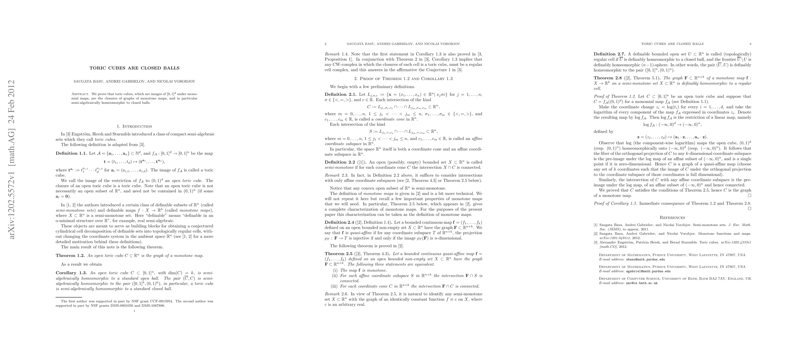 We prove that toric cubes, which are images of $[0,1]^d$ under monomial maps, are the closures of graphs of monotone maps, and in particular semi-algebraically homeomorphic to closed balls.