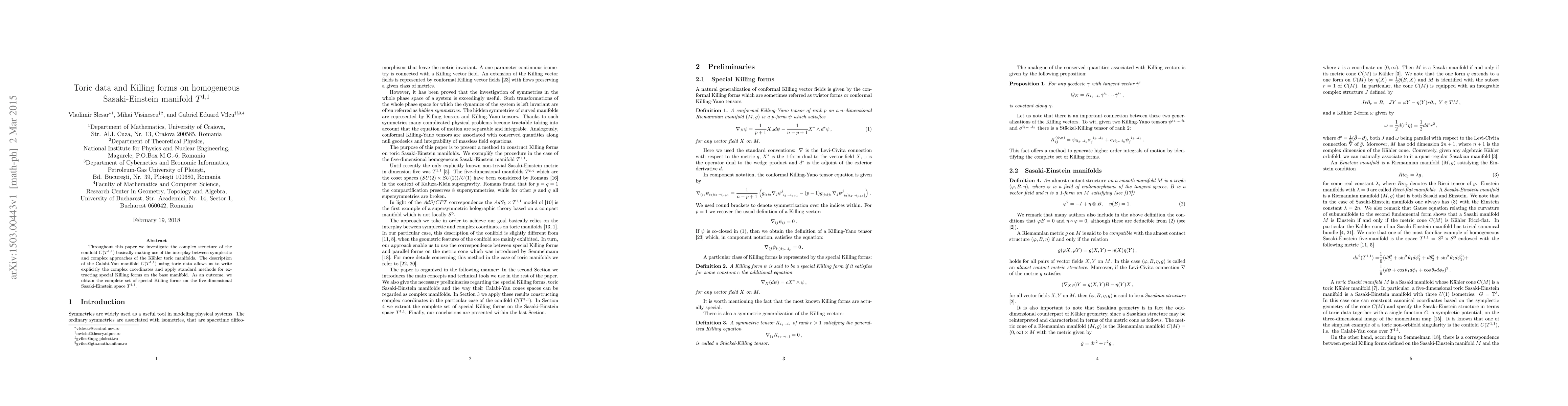 This paper explores the complex structure of the conifold $C(T^{1,1})$ using toric data and the interplay between symplectic and complex approaches of Kähler toric manifolds. It derives the complete set of special Killing forms on the five-dimensional Sasaki-Einstein space $T^{1,1}$.