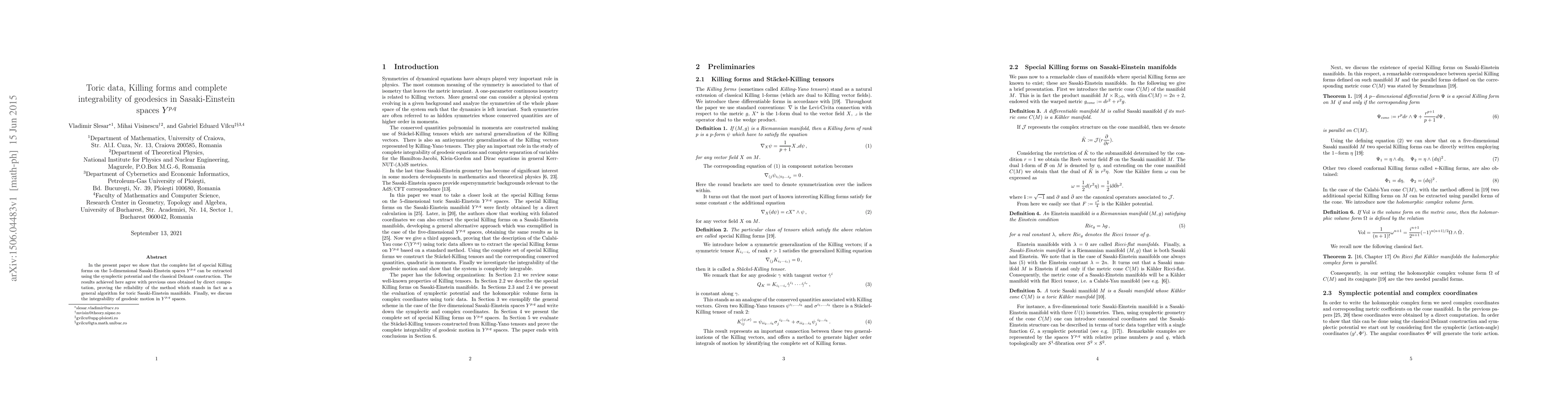 This paper presents a method to extract special Killing forms on 5-dimensional Sasaki-Einstein spaces $Y^{p,q}$ using the symplectic potential and Delzant construction, confirming previous results and establishing a general algorithm for toric Sasaki-Einstein manifolds. It also discusses the complete integrability of geodesic motion in these spaces.