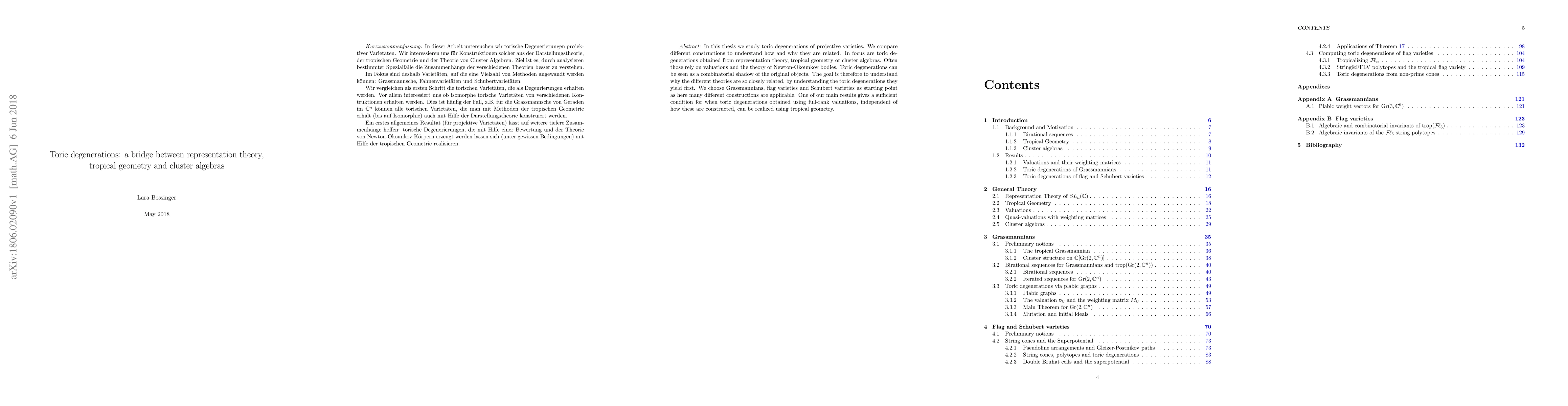 This thesis investigates toric degenerations of projective varieties, focusing on their connections to representation theory, tropical geometry, and cluster algebras. It establishes a sufficient condition for realizing toric degenerations from full-rank valuations using tropical geometry, thereby bridging these mathematical theories.