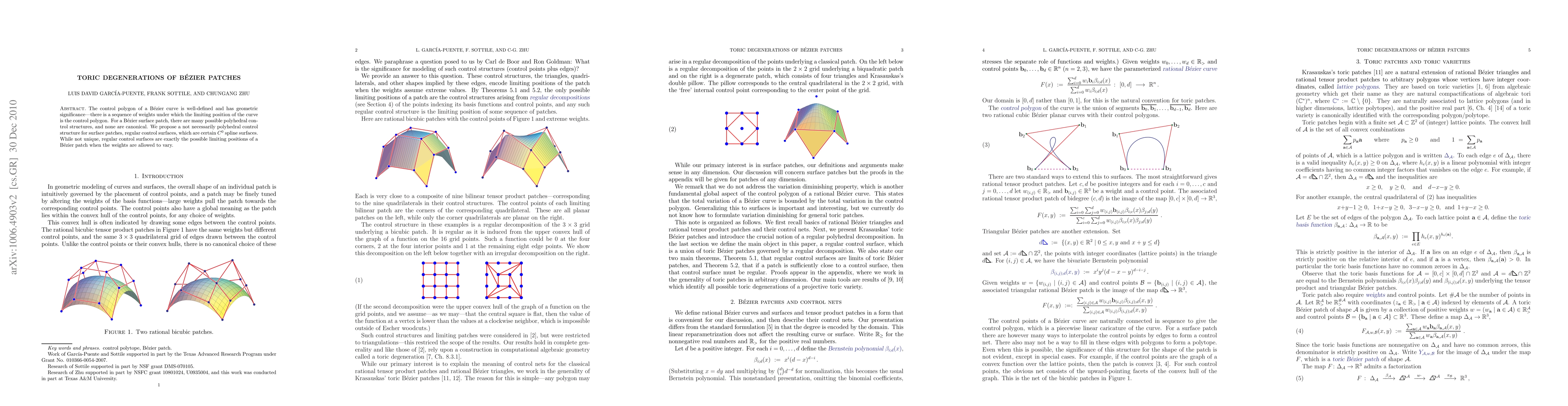 Summary: This paper introduces a novel control structure for Bezier surface patches called regular control surfaces, which are C^0 spline surfaces. These surfaces represent the possible limiting positions of Bezier patches under varying weights, offering a new perspective on the geometric significance of Bezier patches.