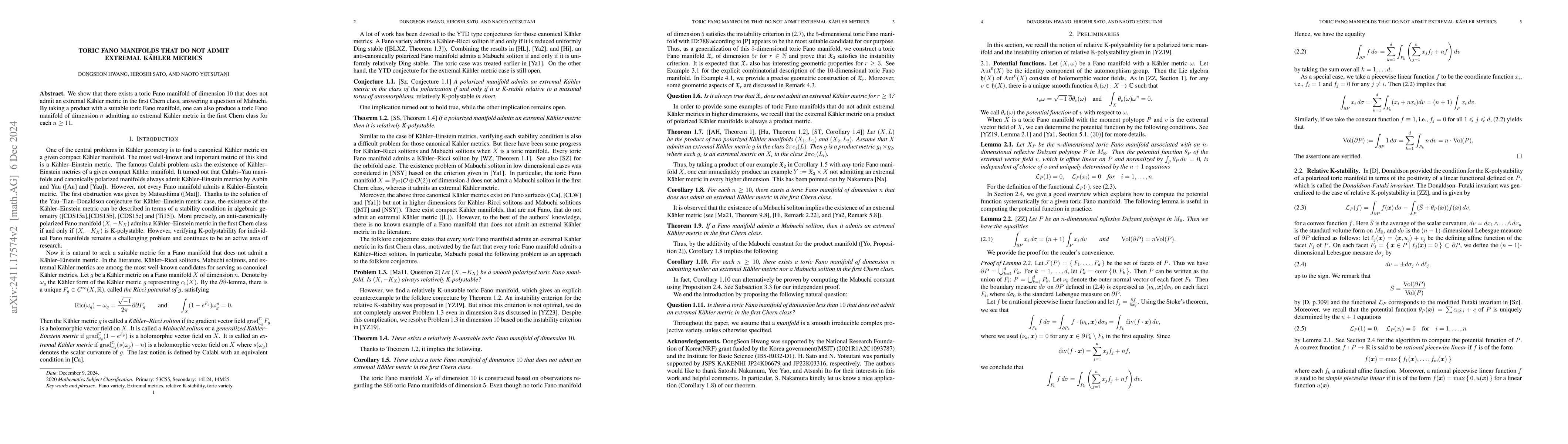 This paper demonstrates the existence of a dimension-10 toric Fano manifold without an extremal Kähler metric, resolving Mabuchi's question. Additionally, it constructs toric Fano manifolds of dimension $n$ (for $n \geq 11$) that similarly lack such metrics.