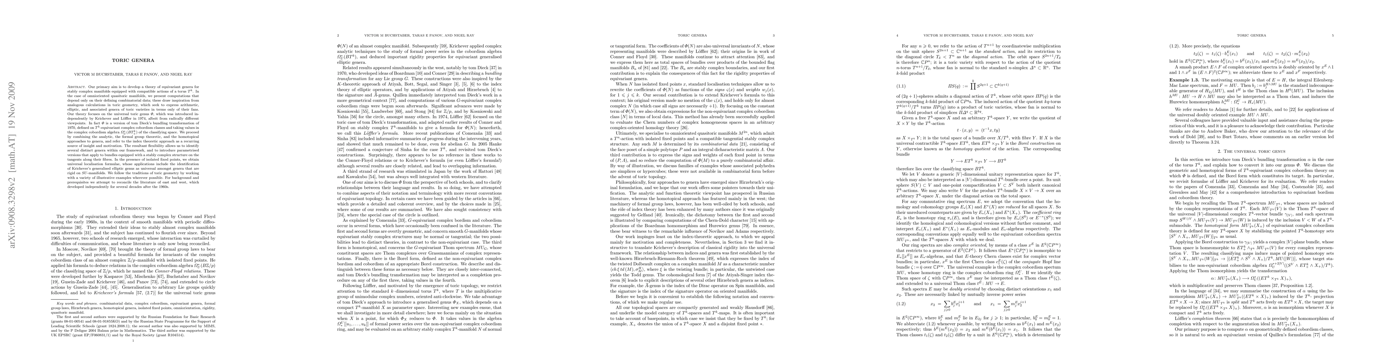 This paper develops a comprehensive theory of equivariant genera for toric manifolds, focusing on the universal toric genus \Phi and its applications. The authors utilize combinatorial data and inspiration from toric geometry to compute these genera, offering a unified framework that reconciles various approaches and identifies several distinct genera for bundles with stably complex structures.
