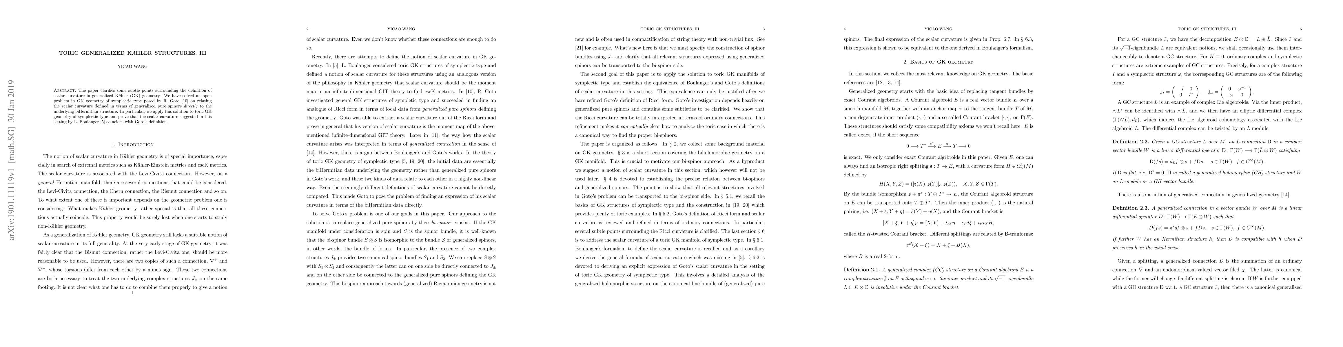 The paper clarifies some subtle points surrounding the definition of scalar curvature in generalized K$\ddot{a}$hler (GK) geometry. We have solved an open problem in GK geometry of symplectic type posed by R. Goto \cite{Go1} on relating the scalar curvature defined in terms of generalized pure spinors \emph{directly} to the underlying biHermitian structure. In particular, we apply this solution to toric GK geometry of symplectic type and prove that the scalar curvature suggested in this setting by L. Boulanger \cite{Bou} coincides with Goto's definition.