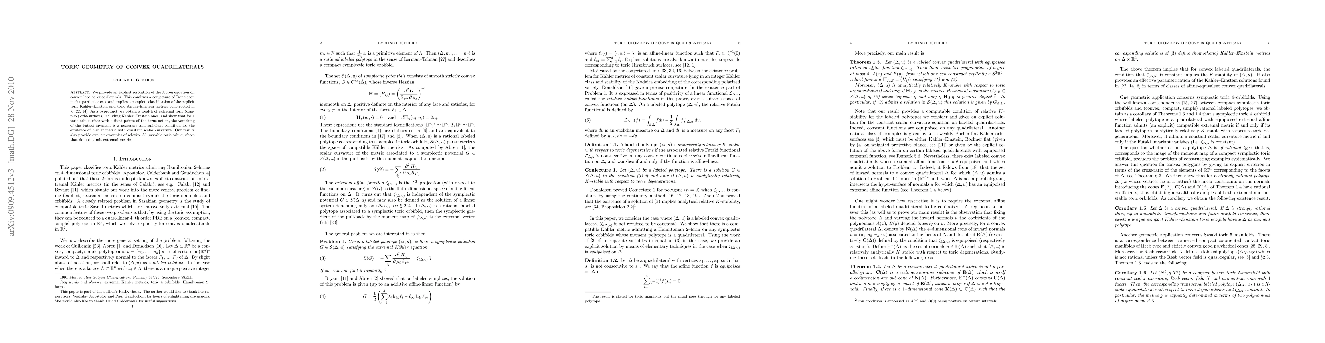 This paper resolves the Abreu equation for convex quadrilaterals, confirming a conjecture by Donaldson and classifying toric Kähler-Einstein and Sasaki-Einstein metrics. It also identifies necessary and sufficient conditions for the existence of Kähler metrics with constant scalar curvature on toric orbi-surfaces with four fixed points.
