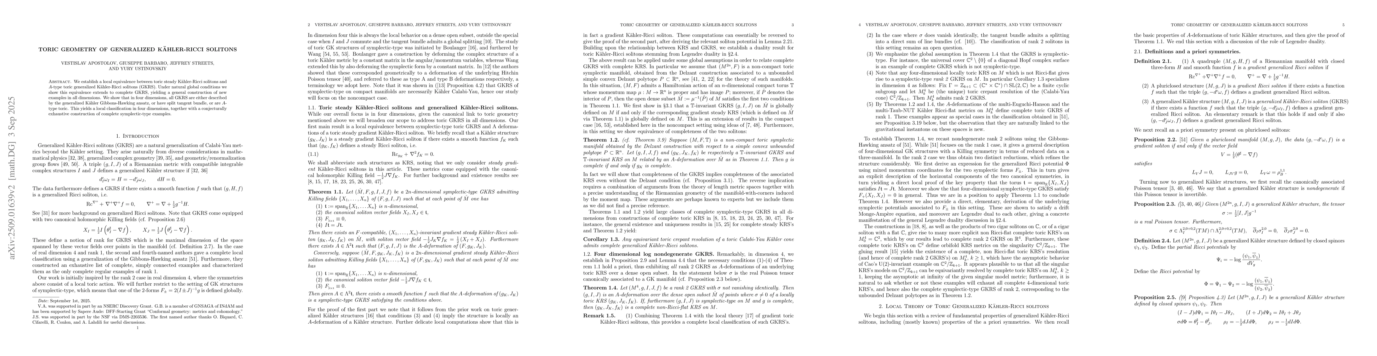 We establish a local equivalence between toric steady K\"ahler-Ricci solitons and $A$-type toric generalized K\"ahler-Ricci solitons (GKRS). Under natural global conditions we show this equivalence extends to complete GKRS, yielding a general construction of new examples in all dimensions. We show that in four dimensions, all GKRS are either described by the generalized K\"ahler Gibbons-Hawking ansatz, or have split tangent bundle, or are $A$-type toric. This yields a local classification in four dimensions, together with a conjecturally exhaustive construction of complete symplectic-type examples.