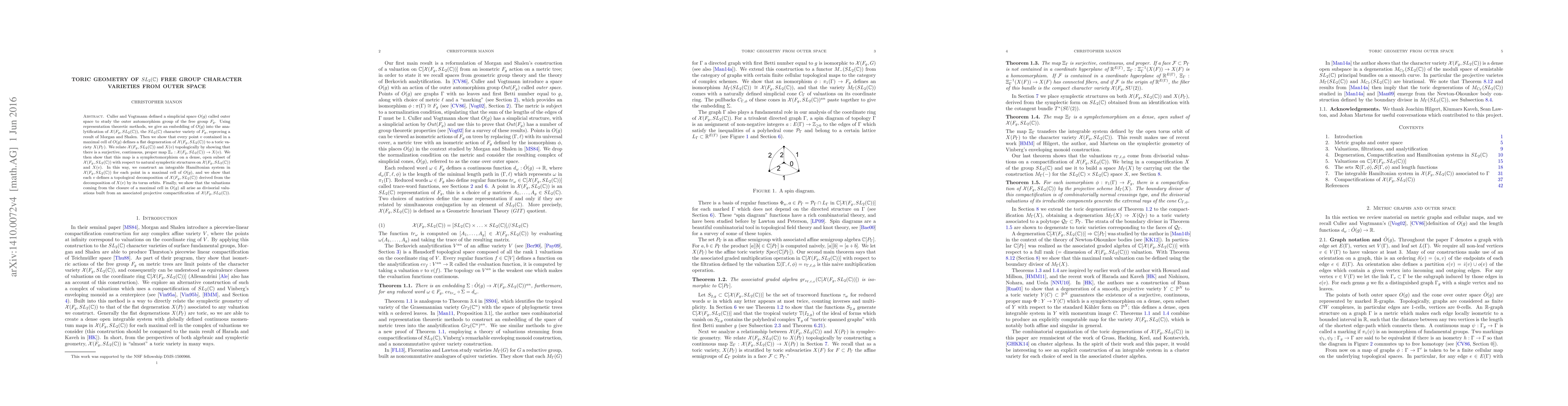 This paper embeds Culler and Vogtmann's outer space into the $SL_2(\mathbb{C})$ character variety of a free group, showing that points in maximal cells of outer space correspond to flat degenerations to toric varieties. The study provides a symplectomorphism between the character variety and the toric variety on a dense open subset, constructing an integrable Hamiltonian system.