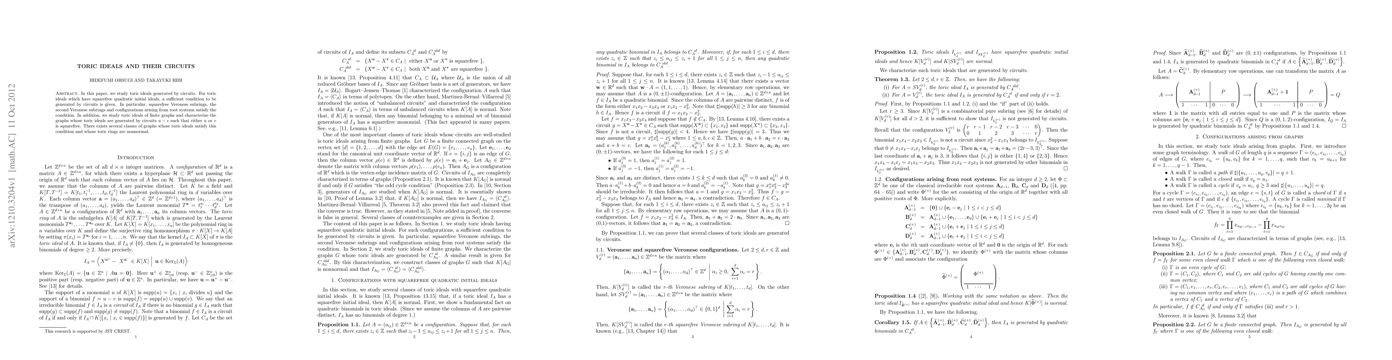 In this paper, we study toric ideals generated by circuits. For toric ideals which have squarefree quadratic initial ideals, a sufficient condition to be generated by circuits is given. In particular, squarefree Veronese subrings, the second Veronese subrings and configurations arising from root systems satisfy the condition. In addition, we study toric ideals of finite graphs and characterize the graphs whose toric ideals are generated by circuits u -v such that either u or v is squarefree. There exists several classes of graphs whose toric ideals satisfy this condition and whose toric rings are nonnormal.
