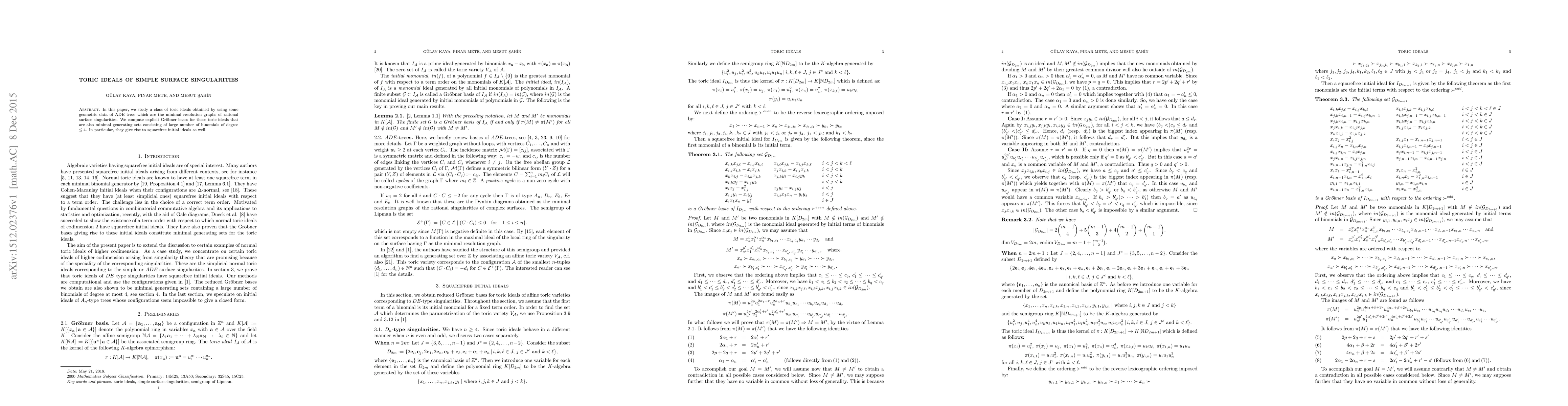 This paper investigates toric ideals derived from the geometric data of ADE trees, which represent the minimal resolution graphs of rational surface singularities. It computes explicit Gröbner bases for these toric ideals, providing minimal generating sets of binomials of degree ≤ 4 that yield squarefree initial ideals.
