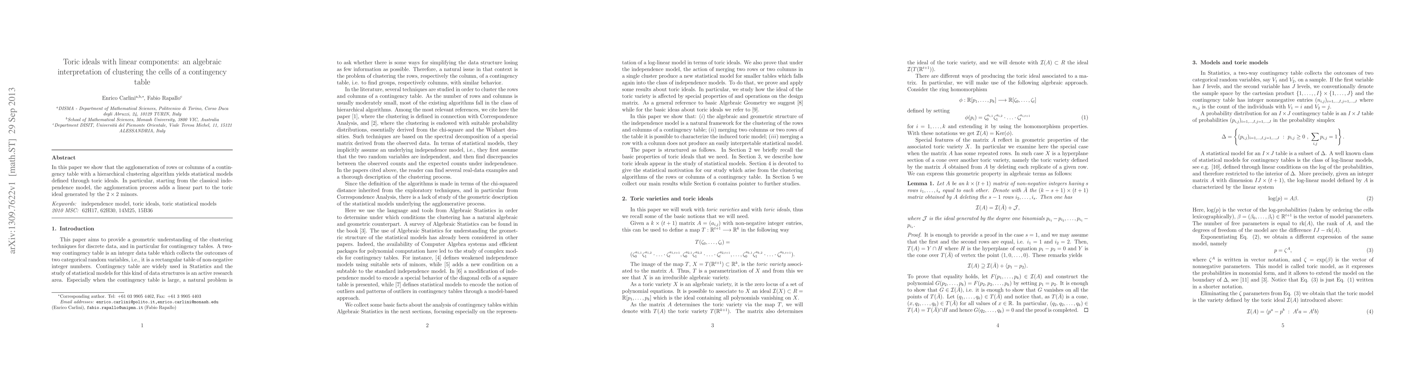 In this paper we show that the agglomeration of rows or columns of a contingency table with a hierarchical clustering algorithm yields statistical models defined through toric ideals. In particular, starting from the classical independence model, the agglomeration process adds a linear part to the toric ideal generated by the $2 \times 2$ minors.