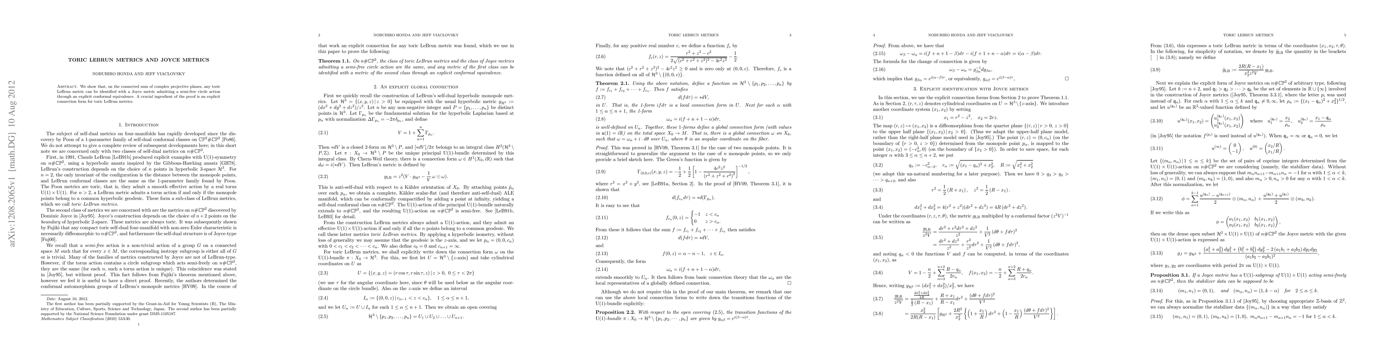 This paper demonstrates a conformal equivalence between toric LeBrun metrics on the connected sum of complex projective planes and Joyce metrics that support a semi-free circle action, utilizing an explicit connection form for the former.