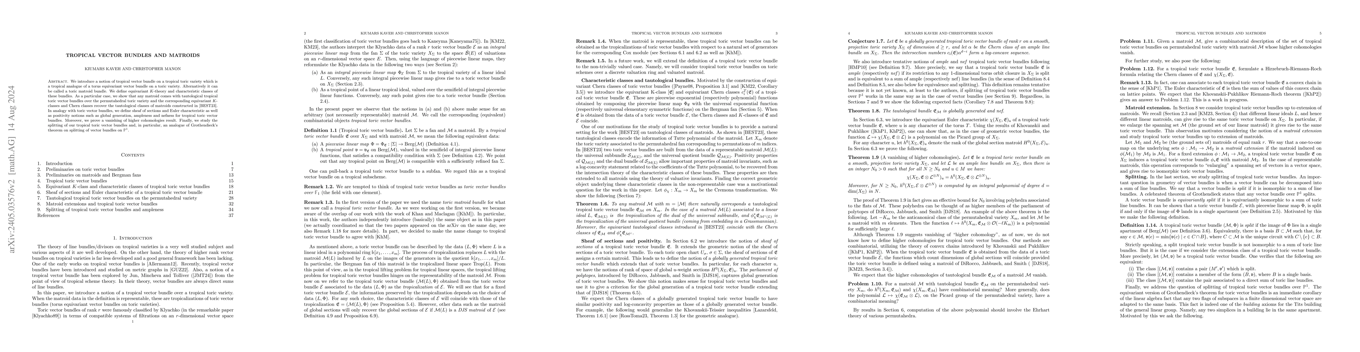 Recent developments have produced new ways to encode the data of a torus equivariant vector bundle over a toric variety using certain representable matroid(s) labeled by polyhedral data. In this paper we show that this data makes sense for non-representable matroids as well. We call the resulting combinatorial objects toric matorid bundles. We define equivariant $K$-theory and characteristic classes of these bundles. As a particular case, we show that any matroid comes with tautological toric matroid bundles over the permutahedral toric variety and the corresponding equivariant K-classes and Chern classes agree with those in the recent work of Berger-Eur-Spink-Tseng on matroid invariants. Moreover, in analogy with toric vector bundles, we define sheaf of sections and Euler characteristic as well as positivity notions such as global generation, ampleness and nefness for toric matroid bundles. Finally, we study the splitting of toric matroid bundles and, in particular, an analogue of Grothendieck's theorem on splitting of vector bundles on the projective line.