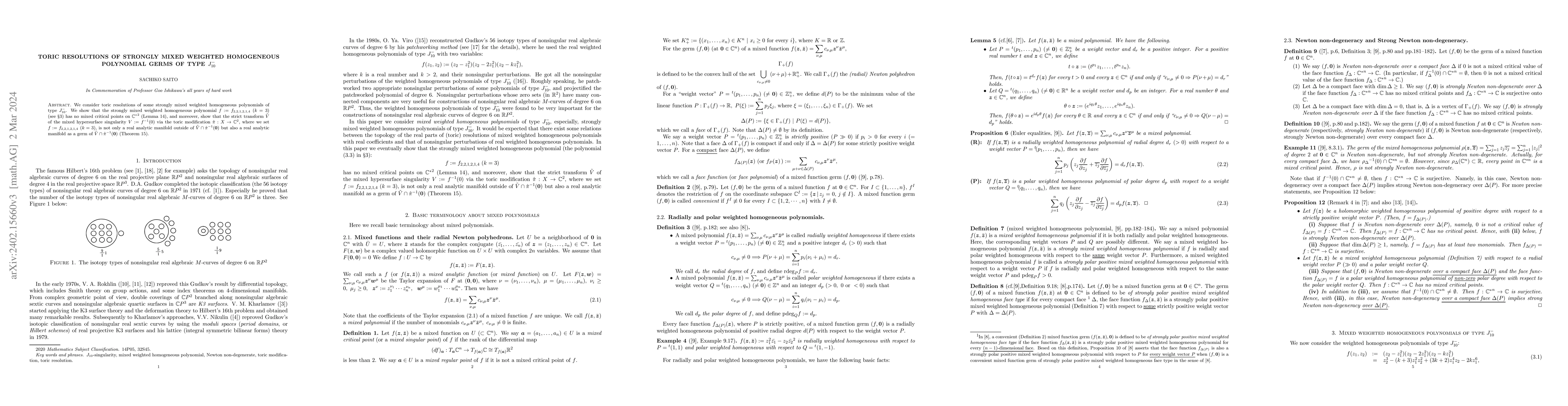 This paper investigates toric resolutions for strongly mixed weighted homogeneous polynomials of type $J_{10}^-$. It proves that the polynomial $f_{2,2,1,2,1,4}$ (with $k=3$) lacks mixed critical points and demonstrates that the strict transform of the singularity via a toric modification is a real analytic manifold both outside and at the intersection with the origin.