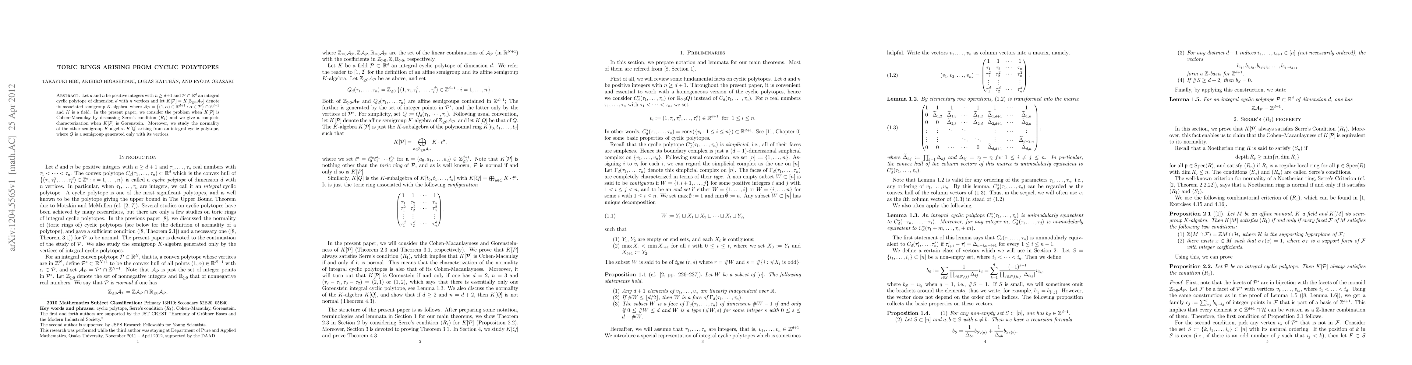 In the present paper, we consider the problem when the toric ring arising from an integral cyclic polytope is Cohen-Macaulay by discussing Serre's condition and we give a complete characterization when that is Gorenstein. Moreover, we study the normality of the other semigroup ring arising from an integral cyclic polytope but generated only with its vertices.